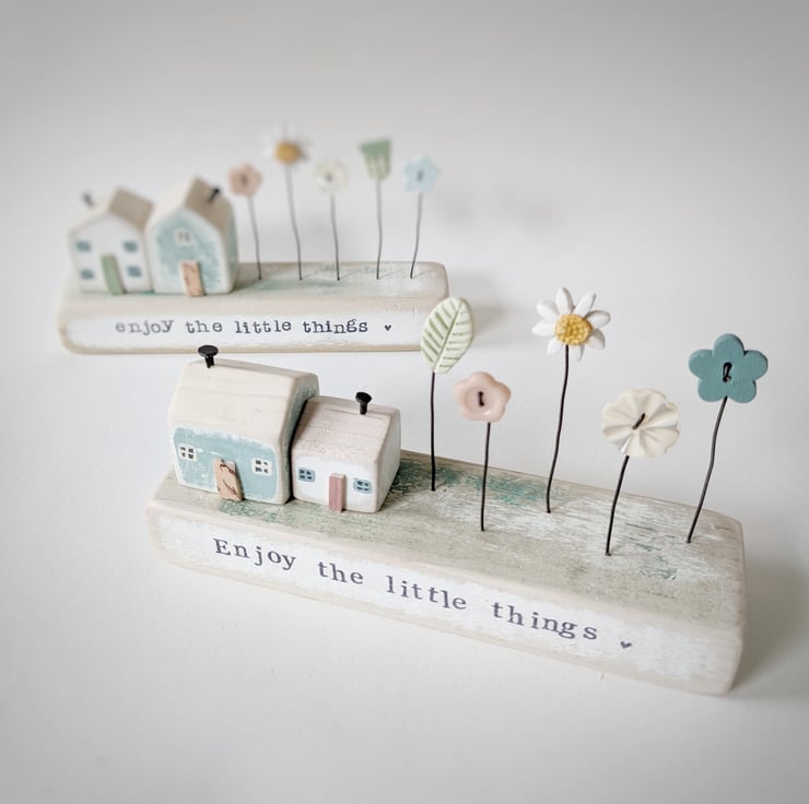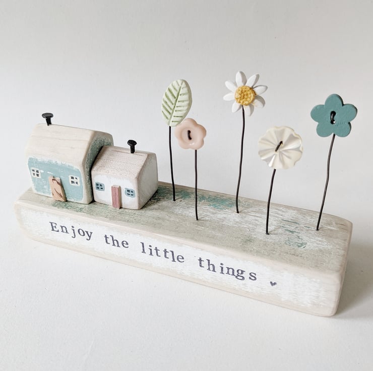 These little hand-painted wooden homes have teeny doors and windows and a garden of button and clay flowers.
