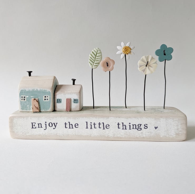 Hand stamped on the front are the words 'Enjoy the little things'.