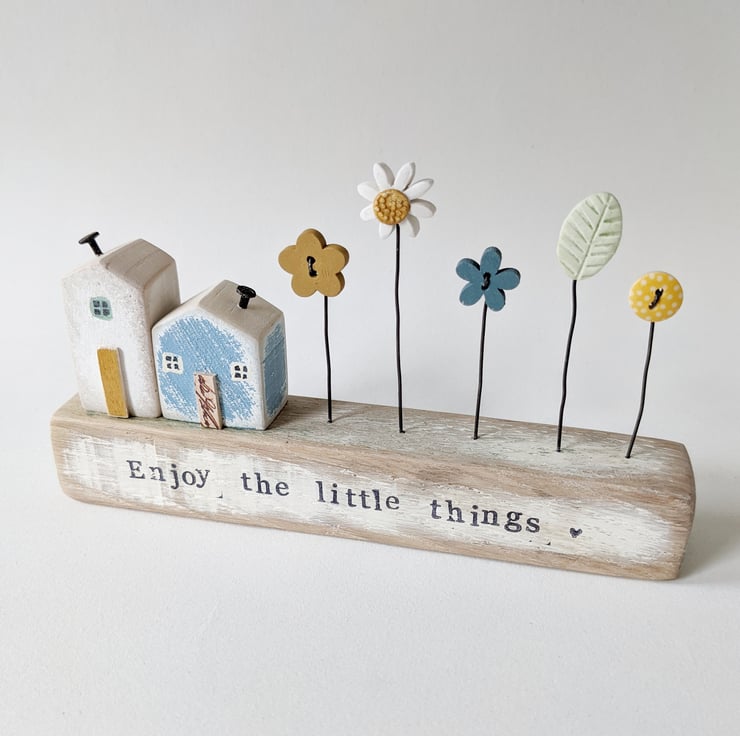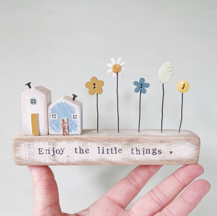 Hand stamped on the front are the words 'Enjoy the little things'.