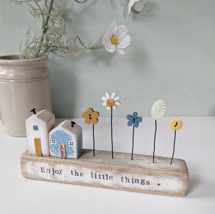 These little hand-painted wooden homes have teeny doors and windows and a garden of button and clay flowers.