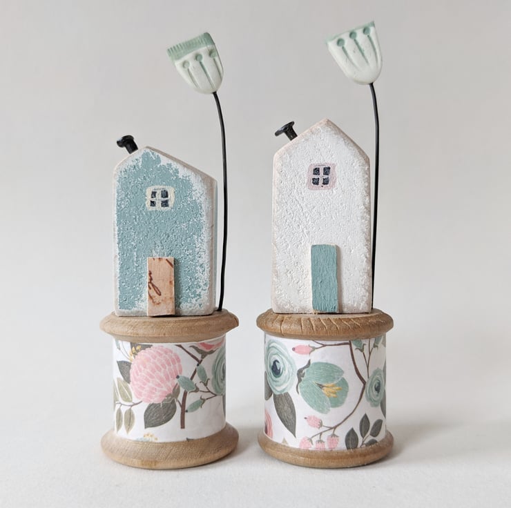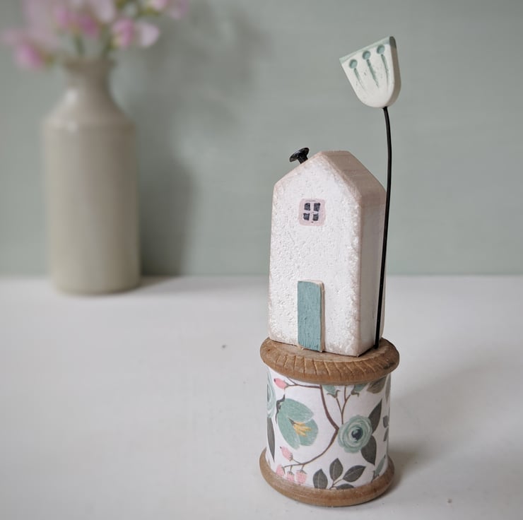 A hand painted little wooden house sits on a vintage bobbin. A patterned and painted clay flower stands beside it.