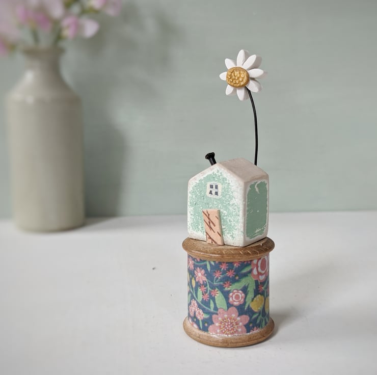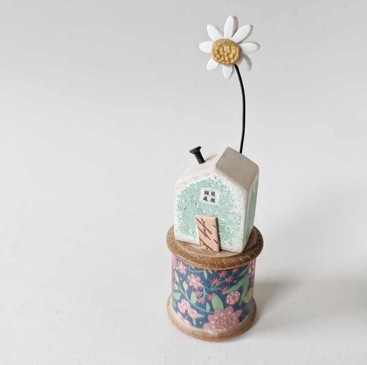 A hand painted little wooden house sits on a vintage bobbin. A patterned and painted clay daisy flower stands beside it.