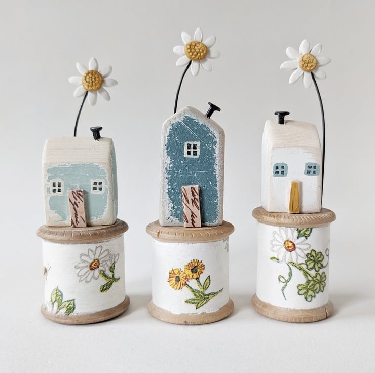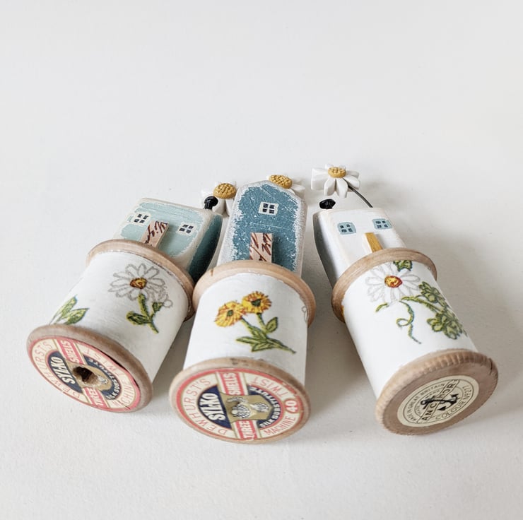 A hand painted little wooden house sits on a vintage bobbin. A patterned and painted clay daisy flower stands beside it.
