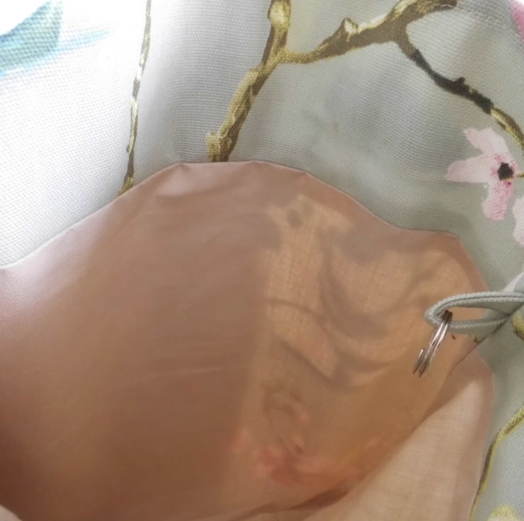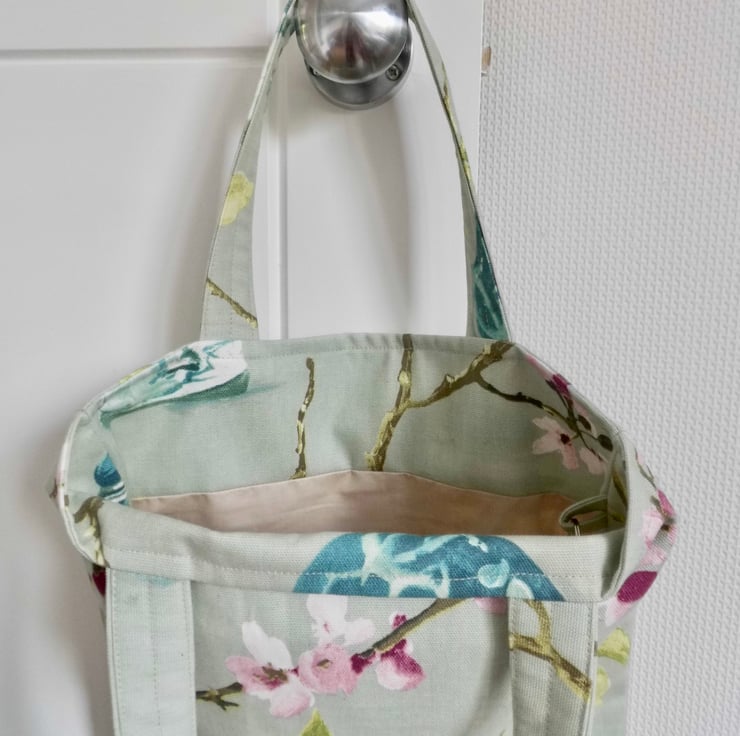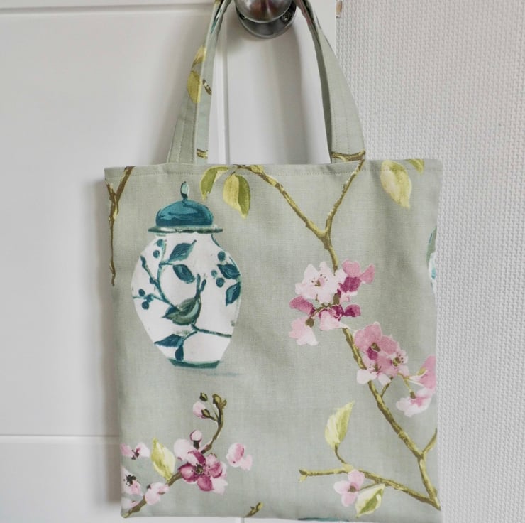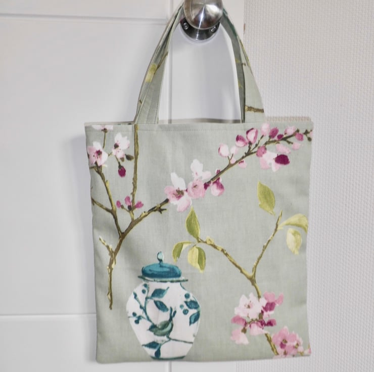 A basic tote bag made using a furnishing weight fabric with a beautiful print on an Oriental theme. It is faced at the top with the same fabric for a neat and professional look and then lined with beige cotton lining fabric. I have inserted a keyring into one of the inside seams, handy for clipping your keys or purse safely inside.
