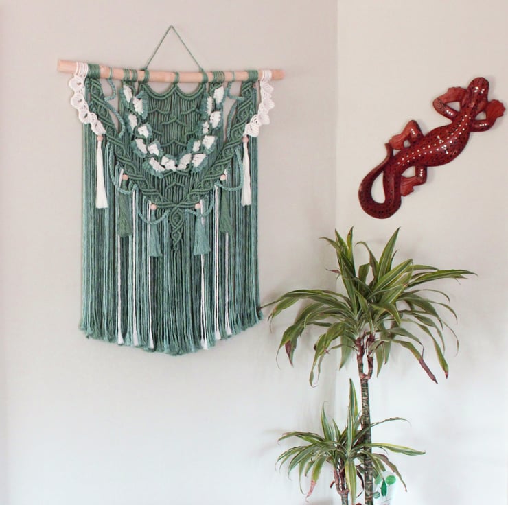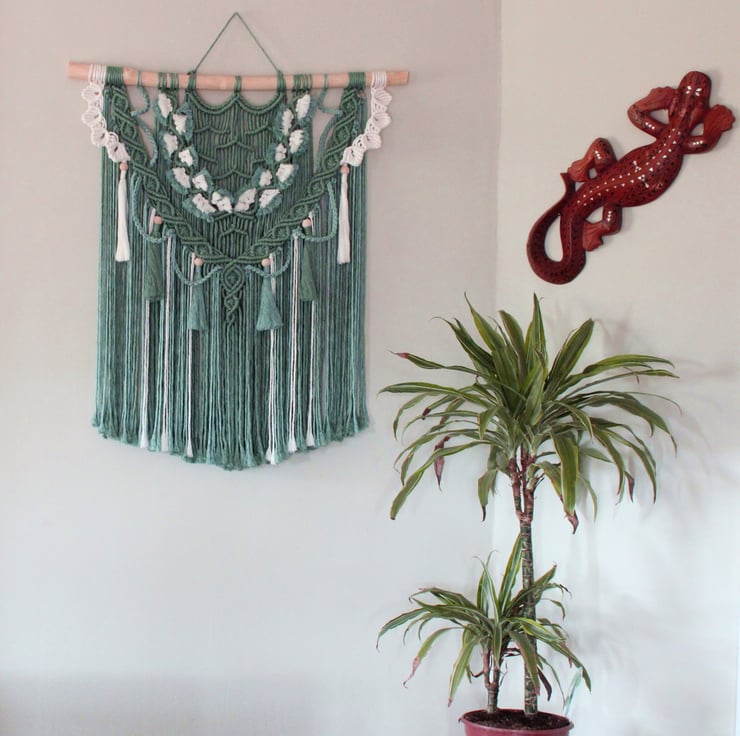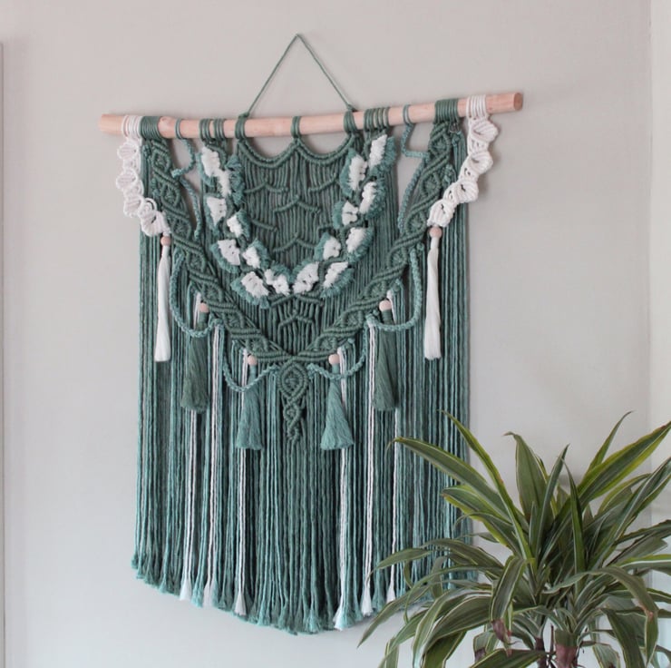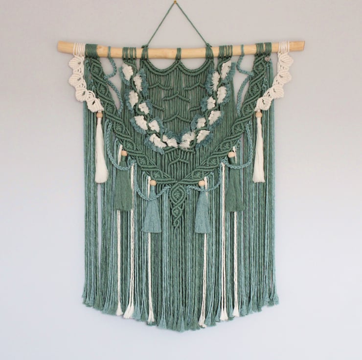 A striking macramé wall decoration ,tied onto a branch that has been sanded smooth and treated with natural bees wax.