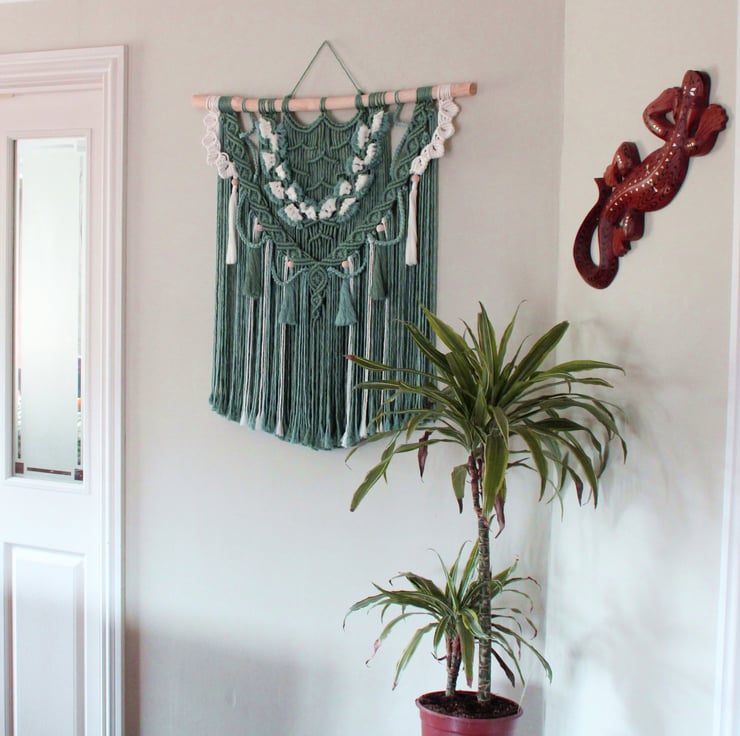 Boho style, Ocean themed large macrame wall hanging made with luxurious bamboo string. The main colour is deep Sea Glass with accents of Arctic and Pearl to give the impression of the ocean. When the light hits the bamboo string it shines like the sun reflecting off water.