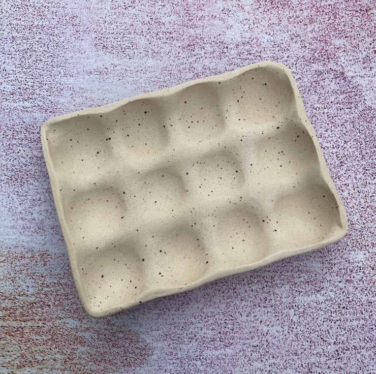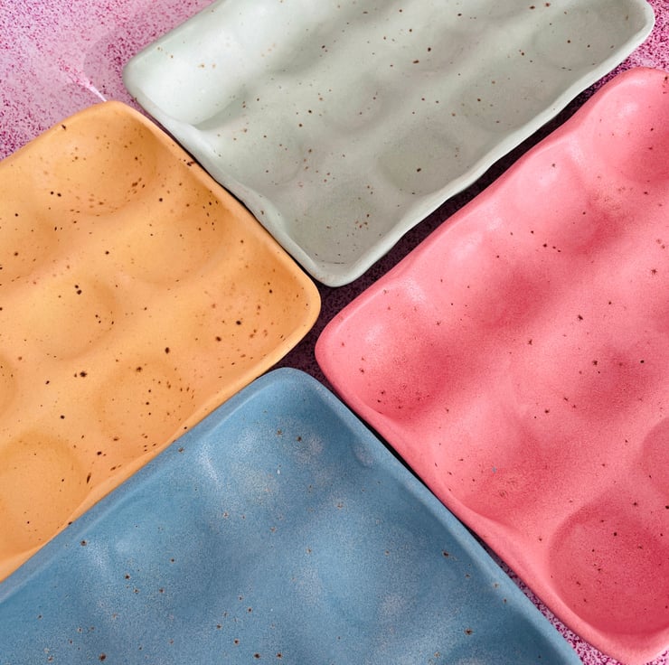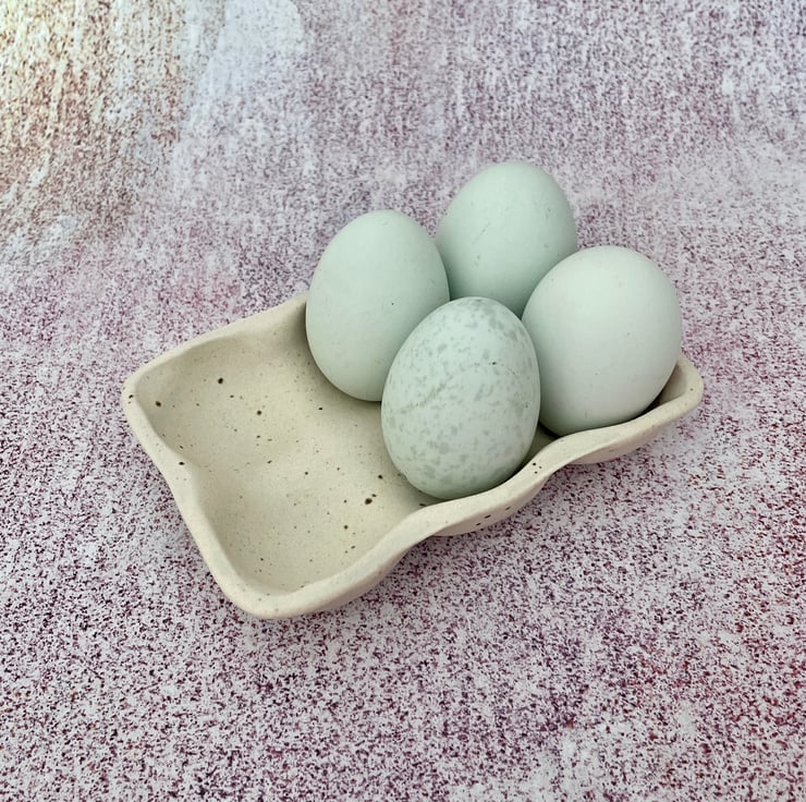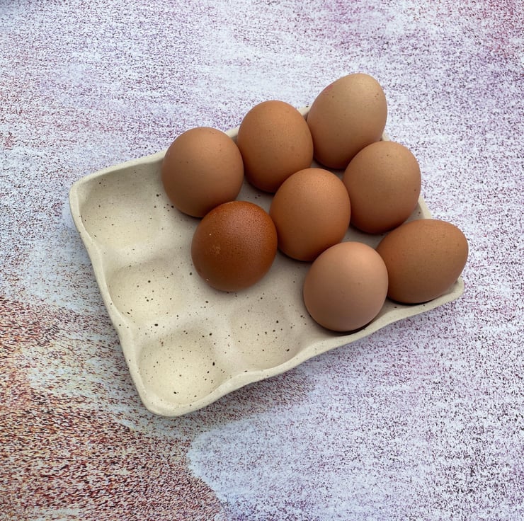 My egg trays are available in 6 or 12 egg sizes, in copper, white with purple speckles or speckled yellow, green, blue, grey, red.