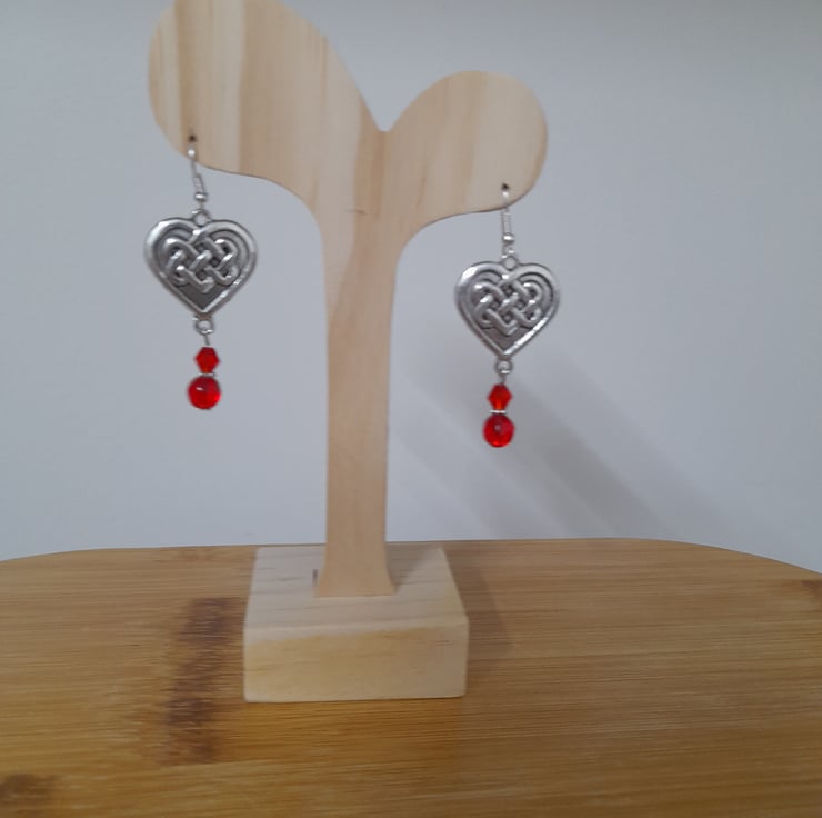 THESE UNIQUE ONE OF A KIND HANDMADE EARRINGS HAVE BEEN MADE WITH A SILVER PLATED HEART SHAPED EARRING CHARM, RED CUT GLASS BEADS HUNG FROM THE CHARM, DAISY SILVER PLATED SPACER BEADS AND FINISHED WITH SILVER PLATED FISH HOOK STYLE EAR WIRES.