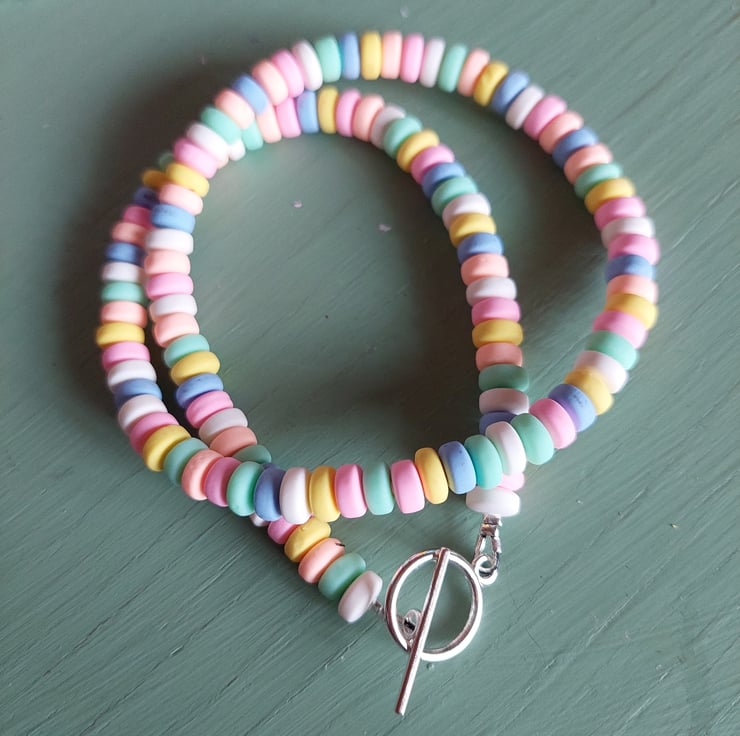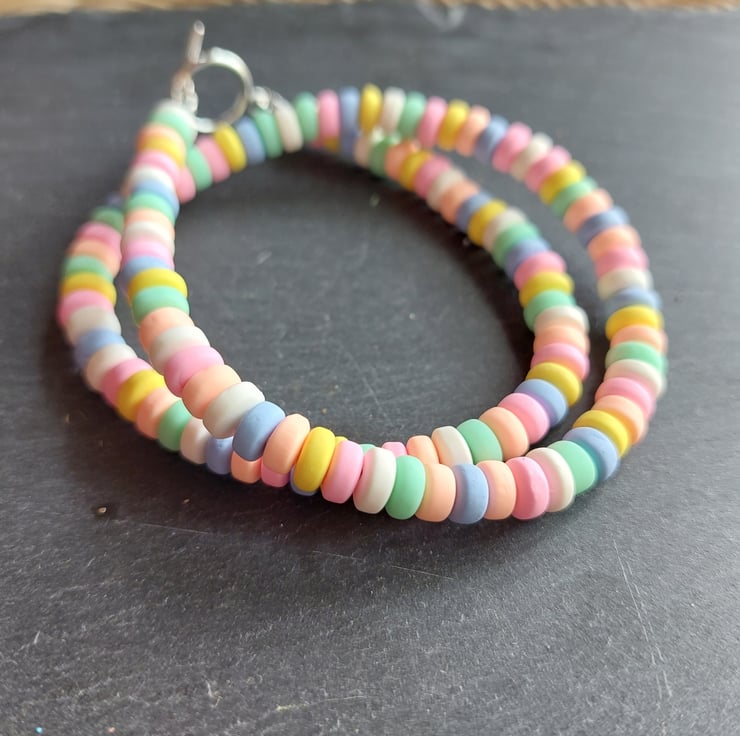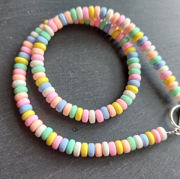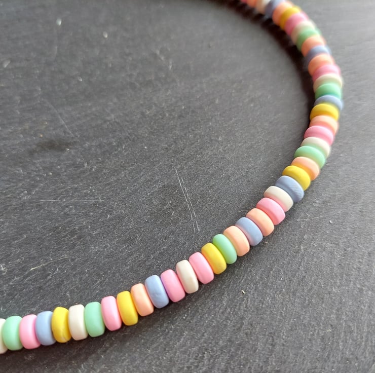 A gorgeous random pastel selection of polymer clay heishi beads are showcased in this kitsch design.