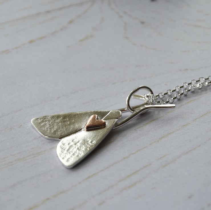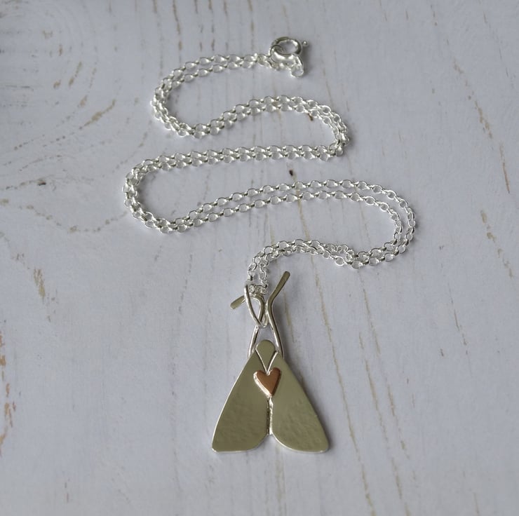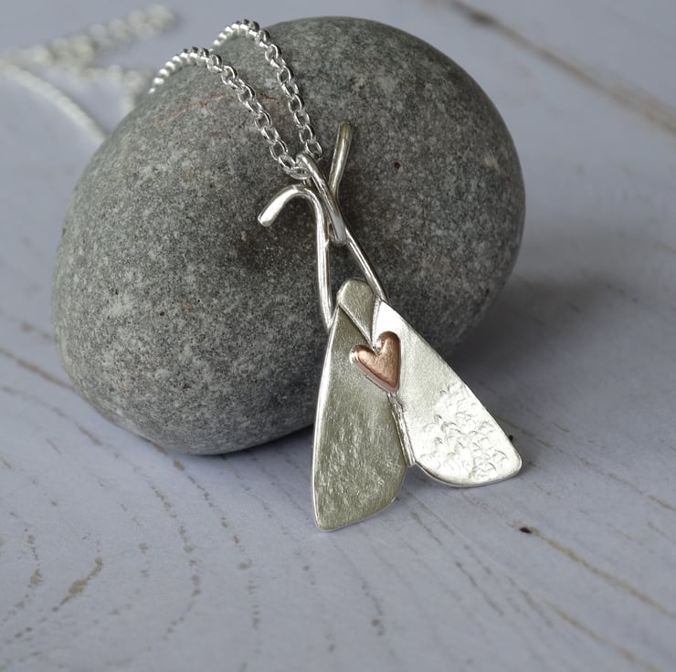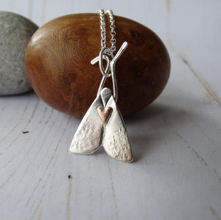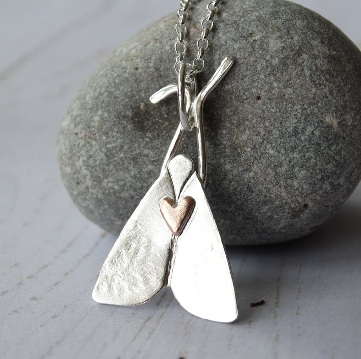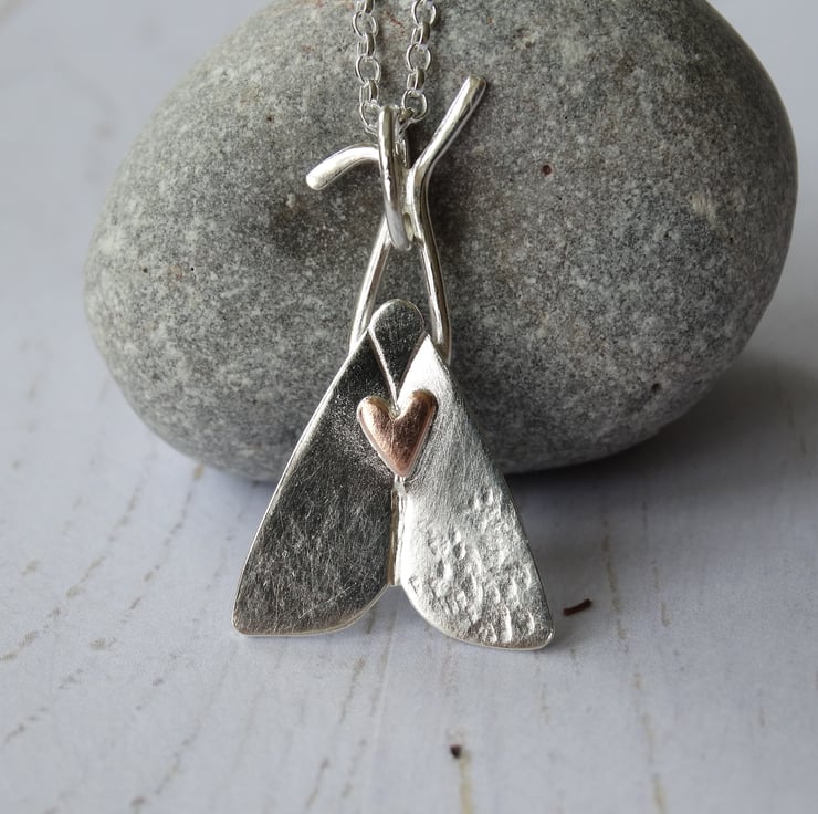 Each of my moths is drawn by hand before being cut out from 100% recycled sterling silver sheet using a jeweller's saw. Tiny antennae, forged from recycled sterling silver wire, are added and the silver is textured and polished by hand, giving each moth its unique character. This one features a tiny copper heart inspired by the orange markings on the moth's wings when closed.