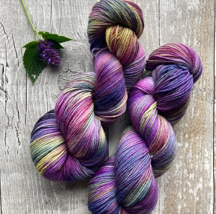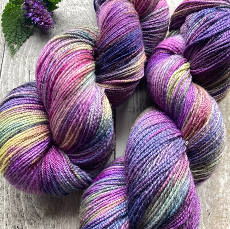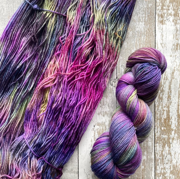 Skein of hand dyed merino yarn approx 400m.