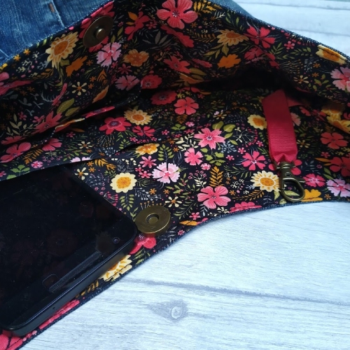 It’s ditsy flower cotton poplin lining gives it a retro boho vibe. The shoulder strap is approx 4cm wide and has been made from a soft, red leather attached to the fabric of the bag with the addition bronze coloured rivets