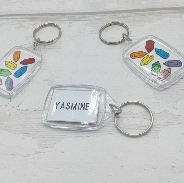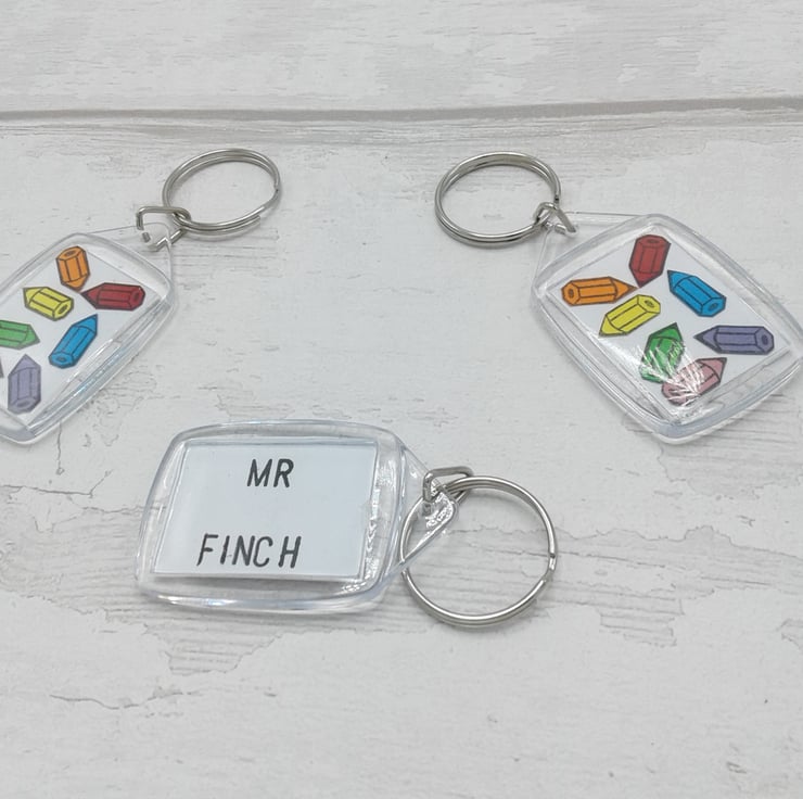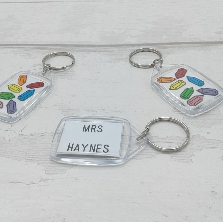 The front of the key rings are decorated with bright pencils and the personalisation is on the reverse.
