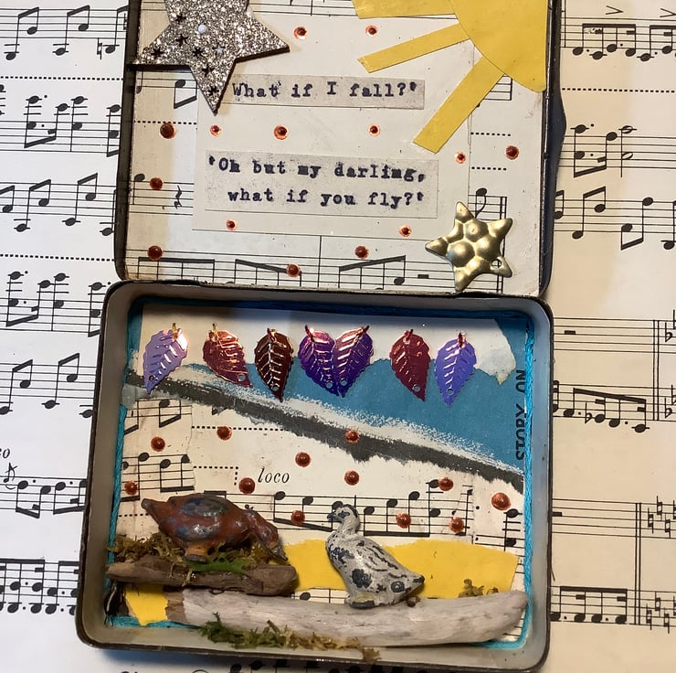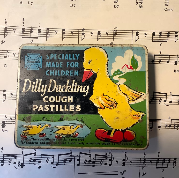 This is a gorgeous vintage tin. I’ve added two vintage lead farmyard ducks to the scene.