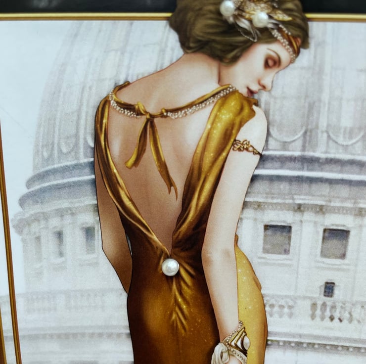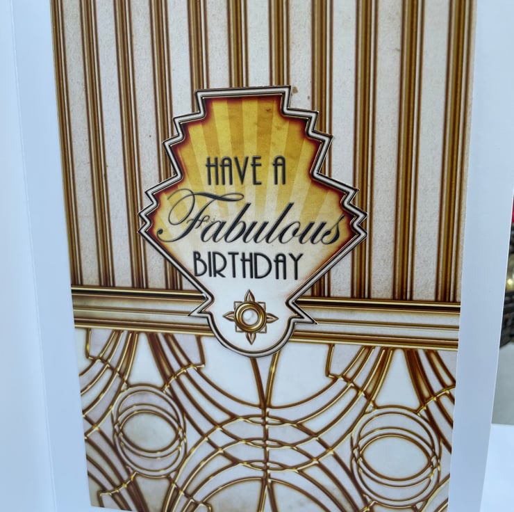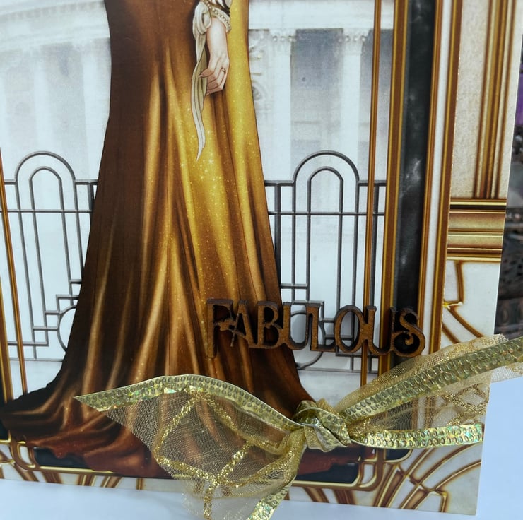 Back to the era of Art Deco. This beautiful A5 sized card features a glamorous lady dressed in a long gold dress. She is standing in front of a window and railings looking outside. This image is on top of Art Deco inspired patterned paper. The design is finished off with pearls, a gold wired ribbon knot and a wooden 'FABULOUS' embellishment. Inside the card has matching paper and a greeting that says Have a fabulous birthday.