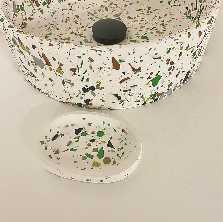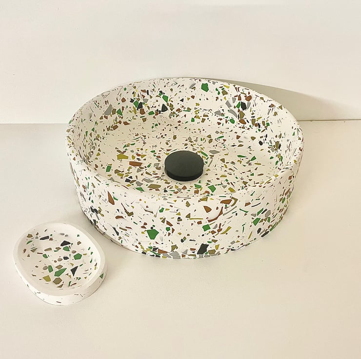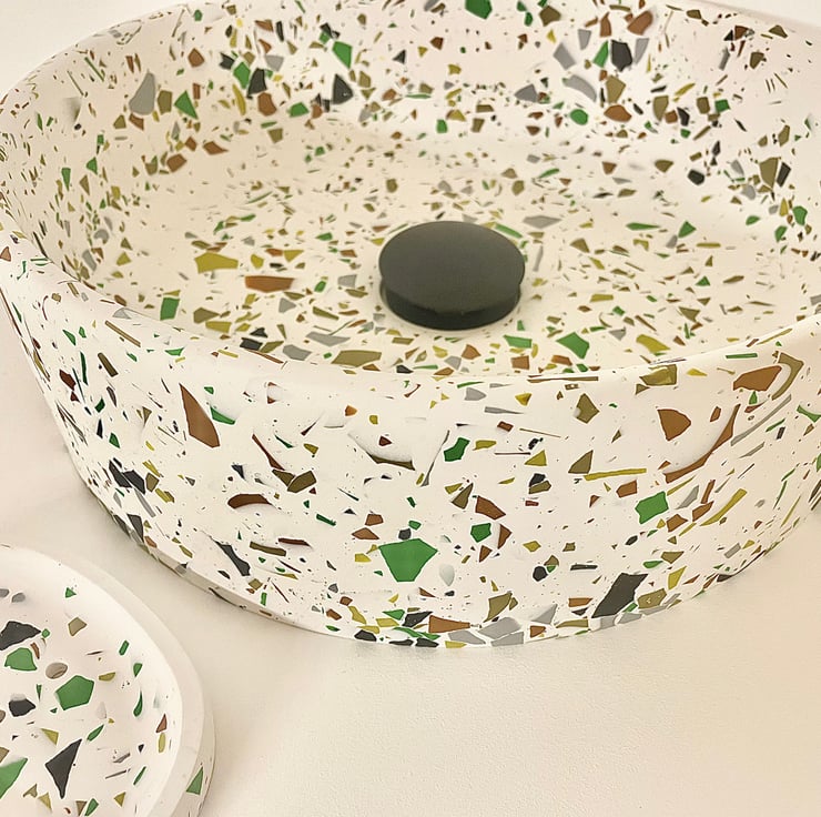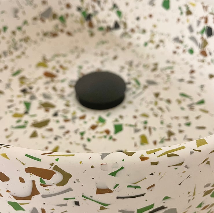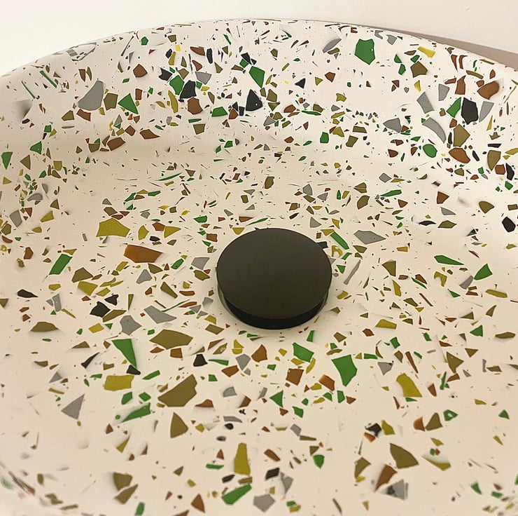 Round Terrazzo compact sink/basin in white with black, brown green and grey terrazzo detailing. Waterproof coated. Perfect for small en-suite bathroom or washroom.
