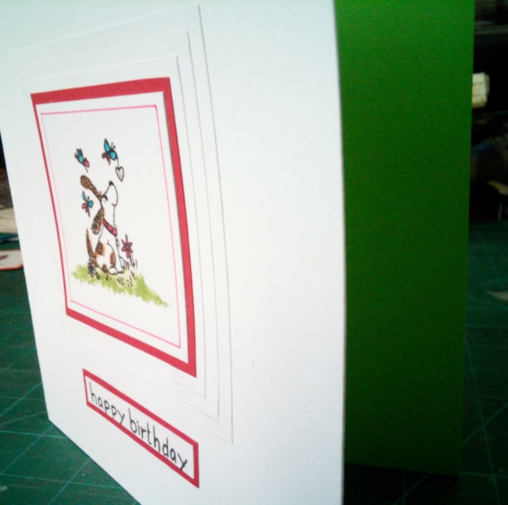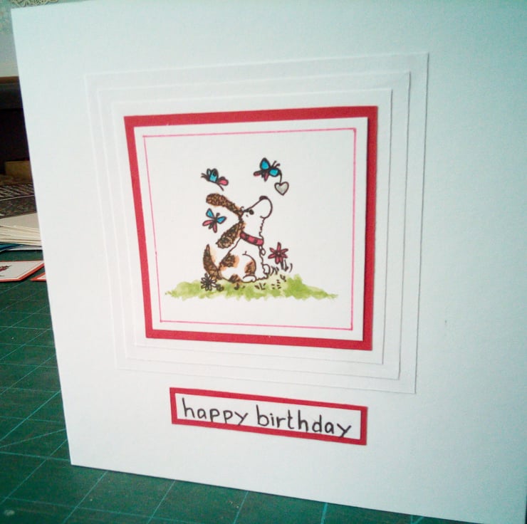 A completely handmade and uniquely designed card. Consisting of a stamped design of cute dog admiring butterflies. Coloured with water colour and glitter pens. Mounted onto red card then 2 layers of white card and finally onto pristine white quality card
