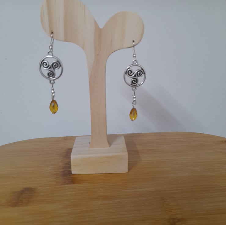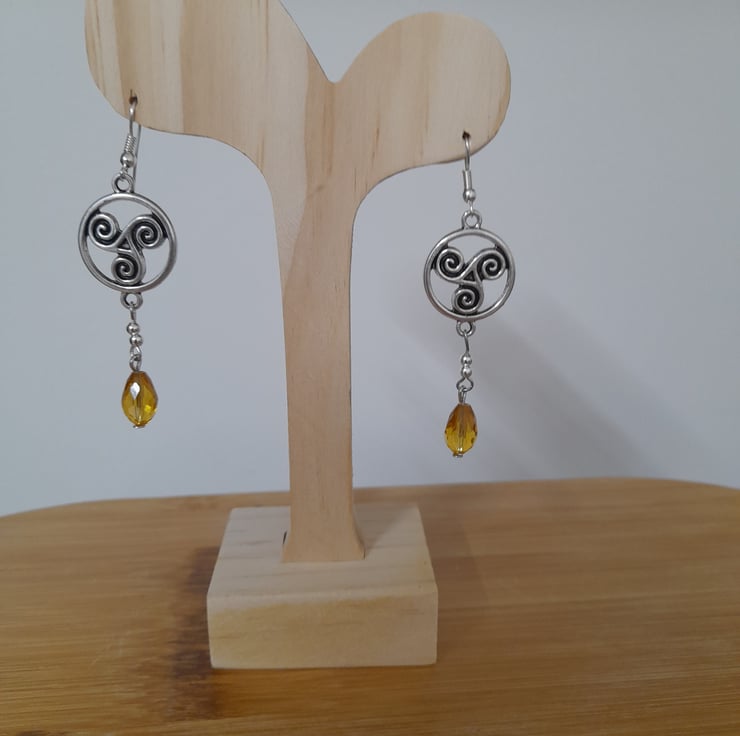 THESE UNIQUE ONE OF A KIND EARRINGS HAVE BEEN MADE USING A CIRCULAR SILVER PLATED EARRING CHARM WITH A CURLY PATTERN WITHIN THE CIRCLE ALONG WITH GOLDEN TEARDROP FACETED GOLDEN GLASS BEADS AND FINISHED WITH SILVER PLACED SPACER BEADS AND SILVER PLATED FISH HOOK DESIGN EAR WIRES.