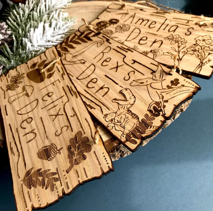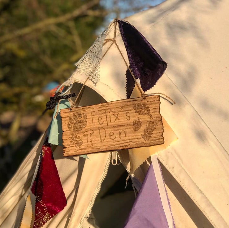 Personalised beautiful Wooden Den Signs - the perfect decoration to hang on any teepee, playhouse or party tent. Great to take camping or to decorate a forest school area, or even just to hang up in your own garden.