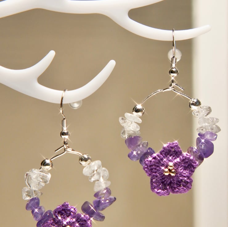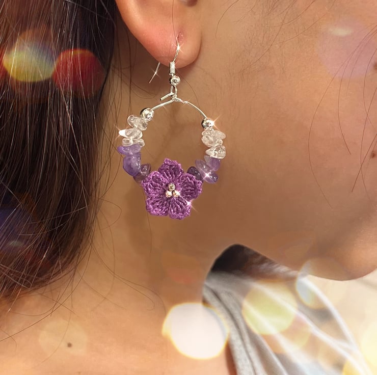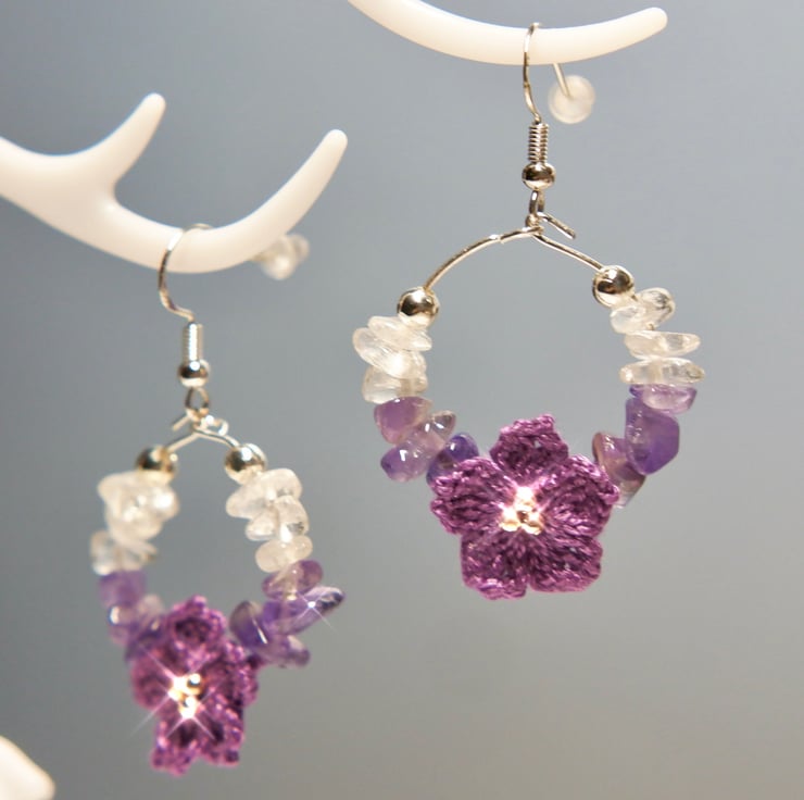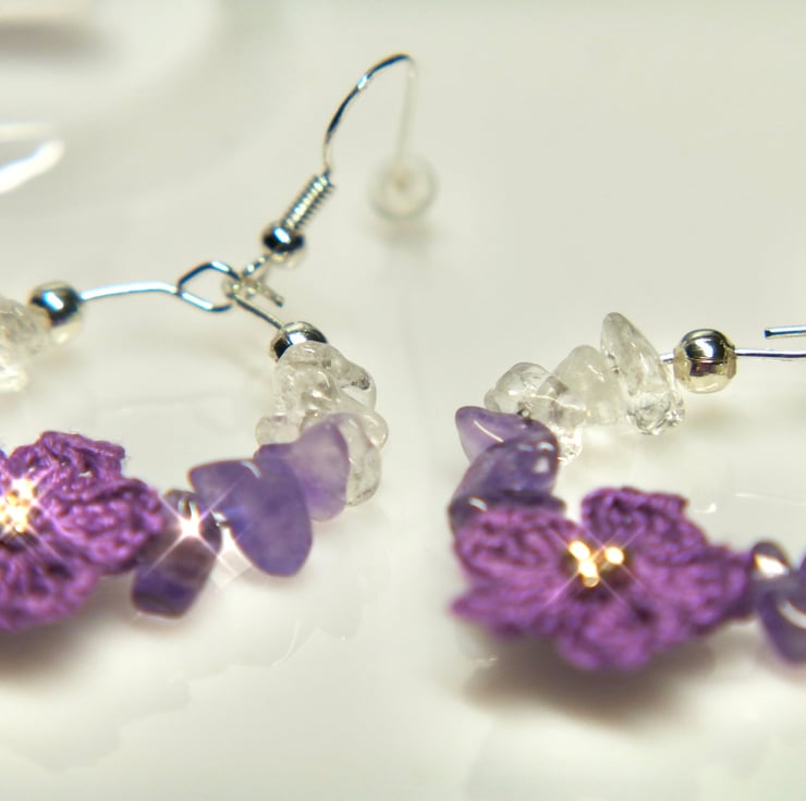 Earrings made with Amethyst chip beads , Clear White Quartz and Embroidery Threads.