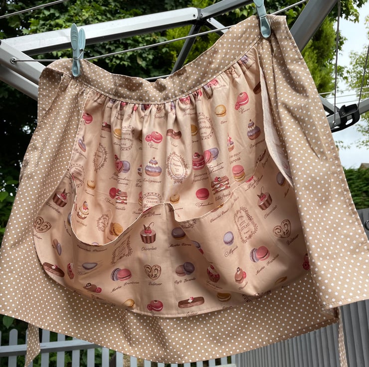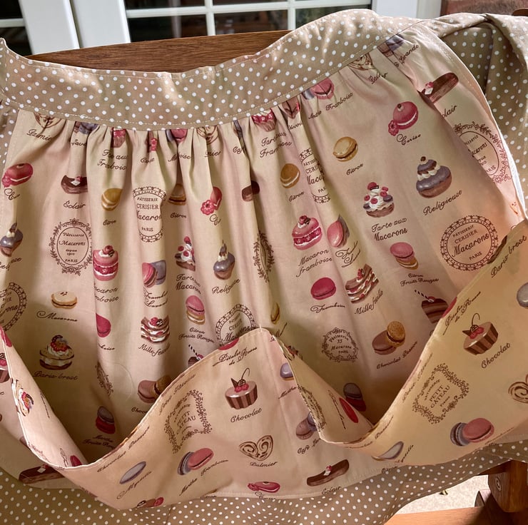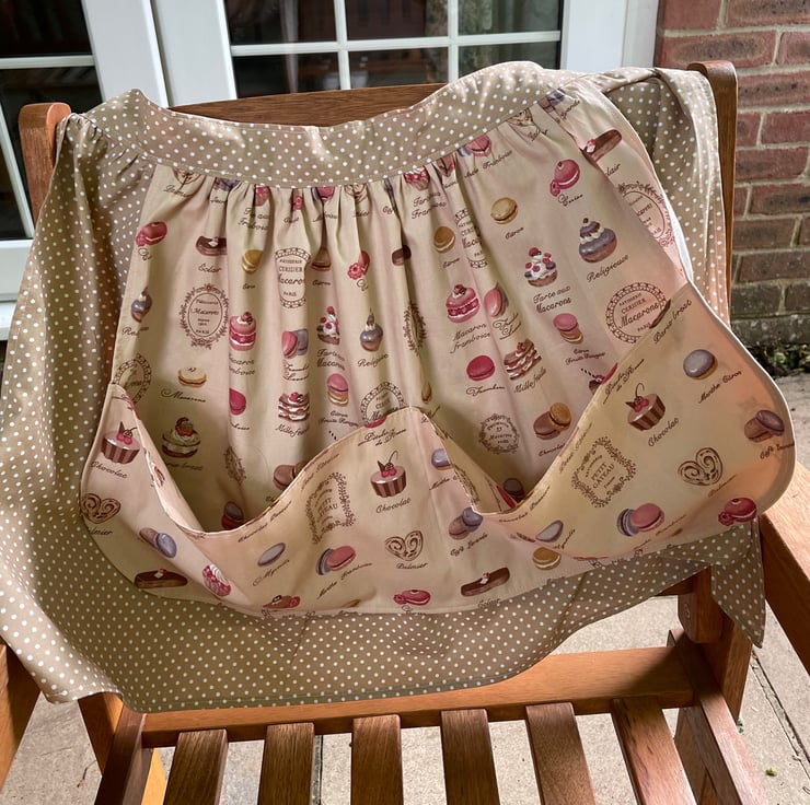 Pretty polka dot base apron with a layer of patisserie print with a large pocket. Ties and waistband polka dot cotton.