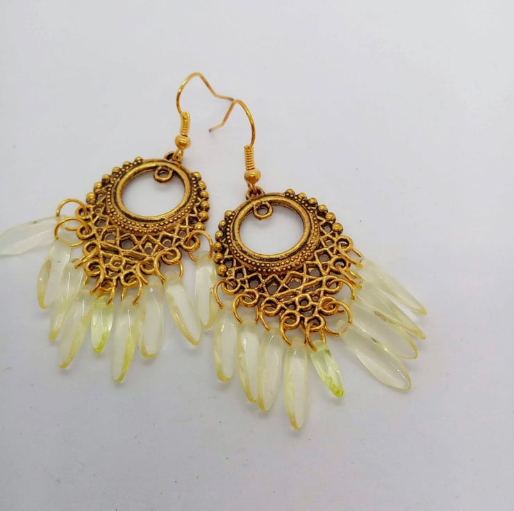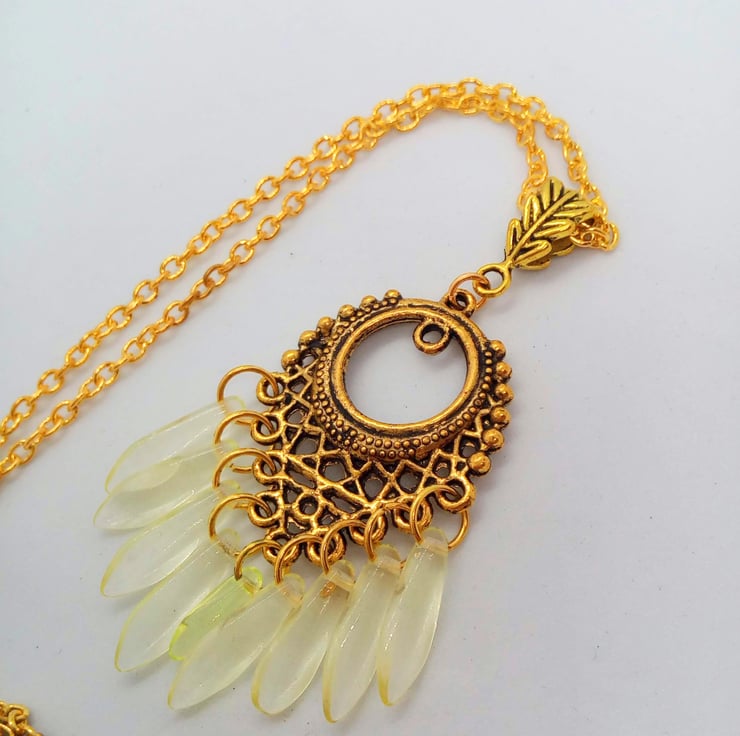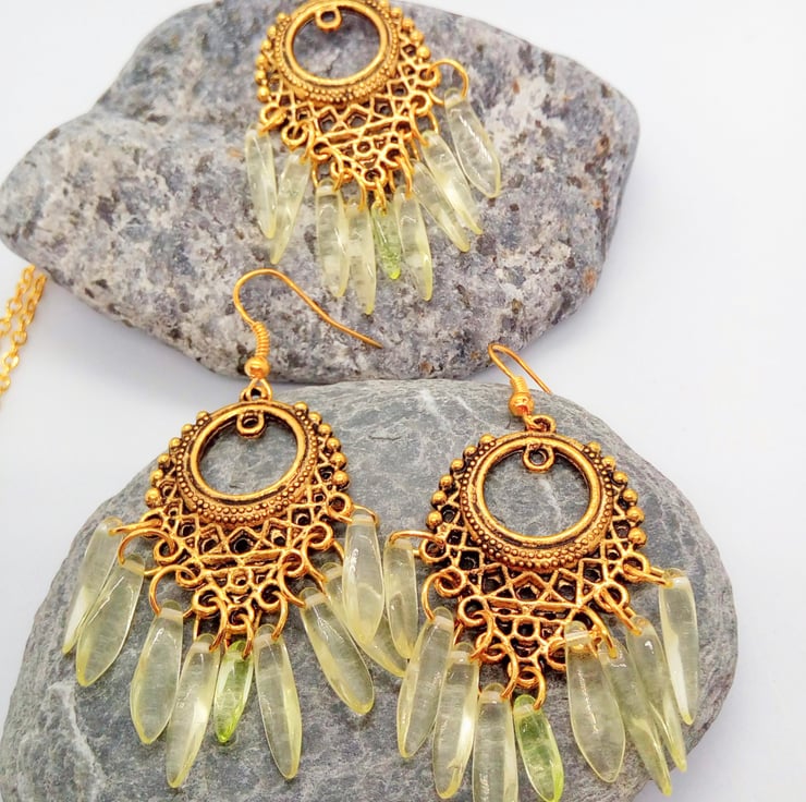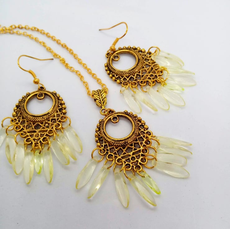 The pendant is made using a 35mm x 25mm teardrop shaped gold plated chandelier dreamcatcher style connector from which 9 18mm x 5mm yellow dagger beads have been attached. This is suspended on a gold plated chain with a gold plated feather bail and secured with a gold plated lobster clasp. The earrings are made in the same way as the pendant and have gold plated ear wires.