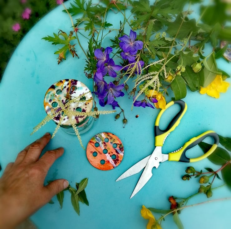 This set of two colourful Flower Frogs, start off life as a circle, hand cut from a rolled slab of clay.