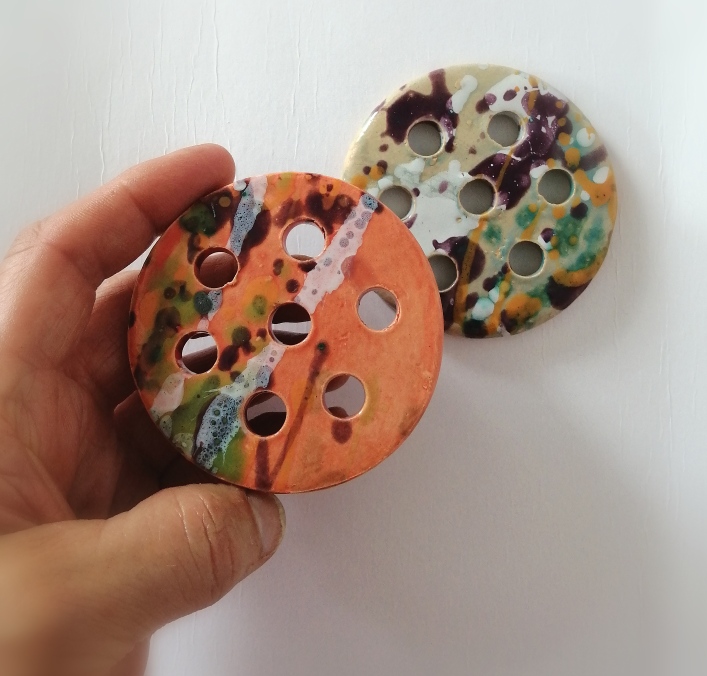After leaving to dry to a leather hard state, a variety of holes can be made through the ceramic disc safely, without distorting the shape.