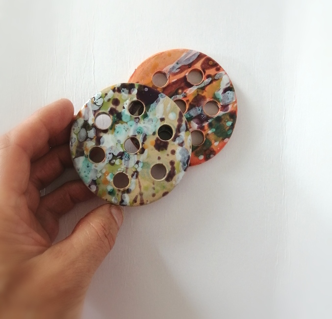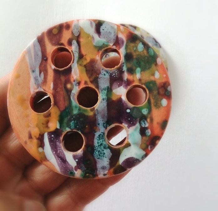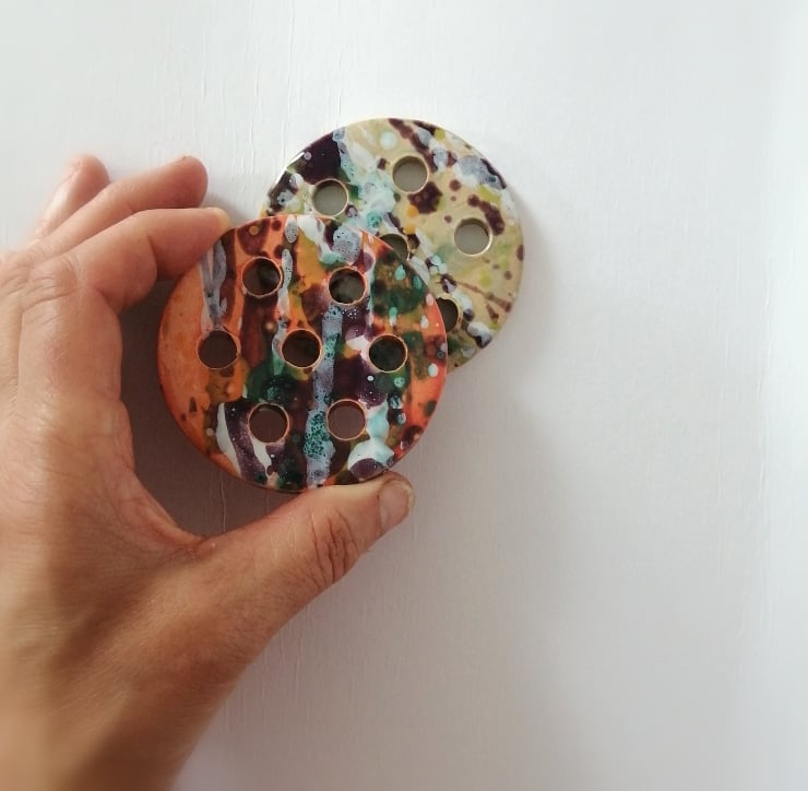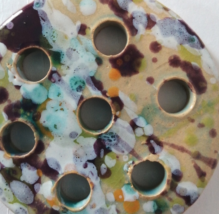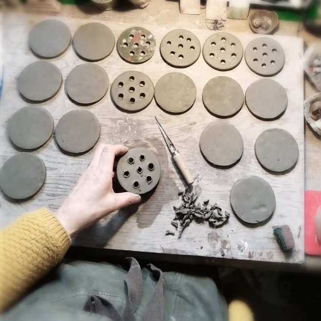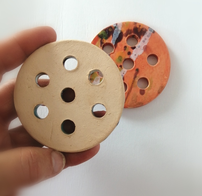 After leaving to dry to a leather hard state, a variety of holes can be made through the ceramic disc, safely, without distorting the shape.