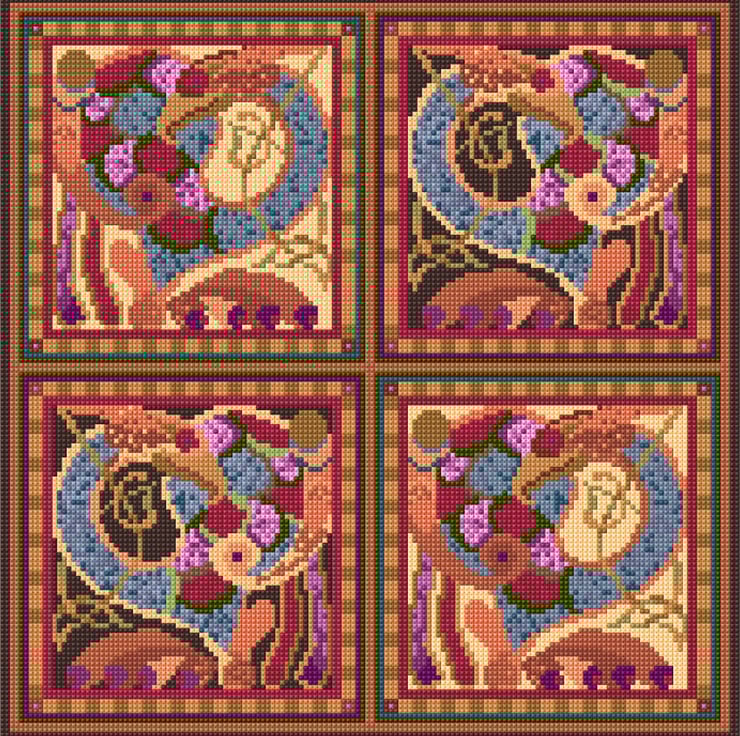Very rich wool colours have been used on either a cream or a dark background. The central panels are edged with a simple border of gold squares.