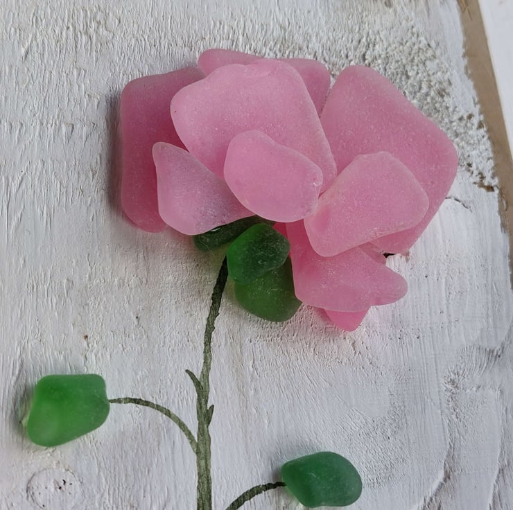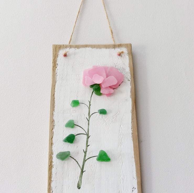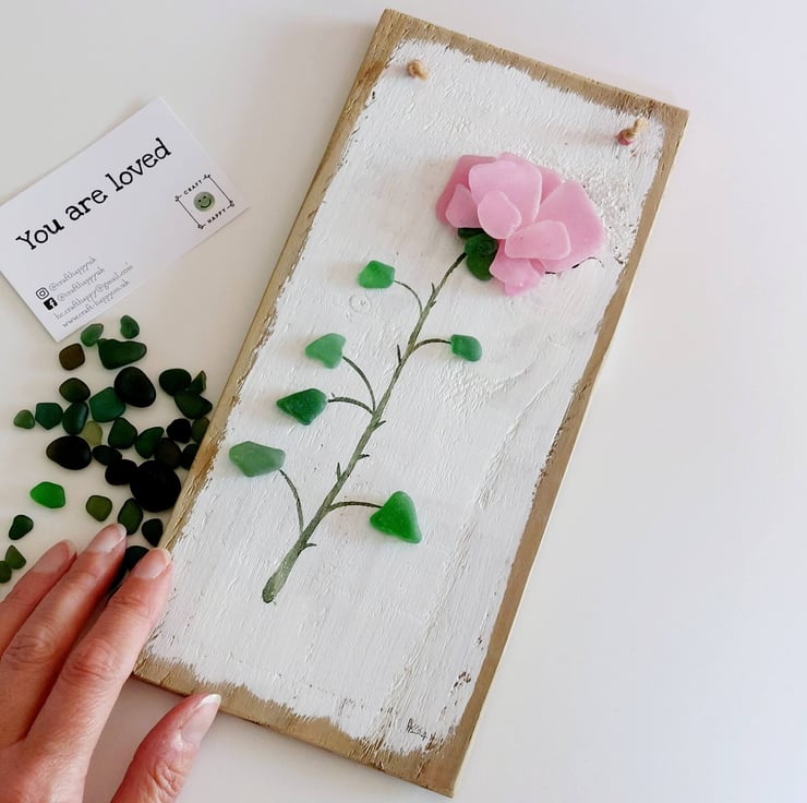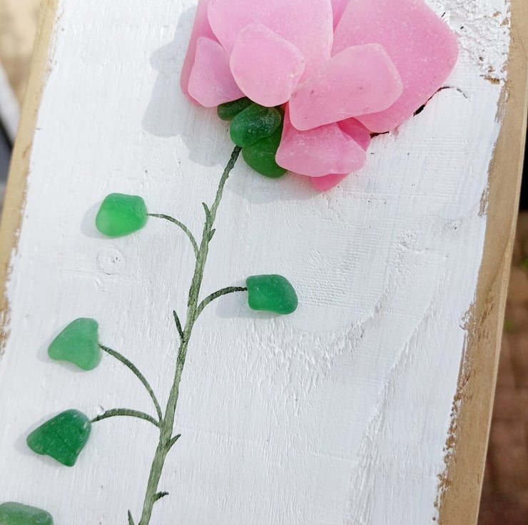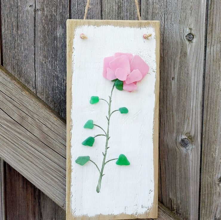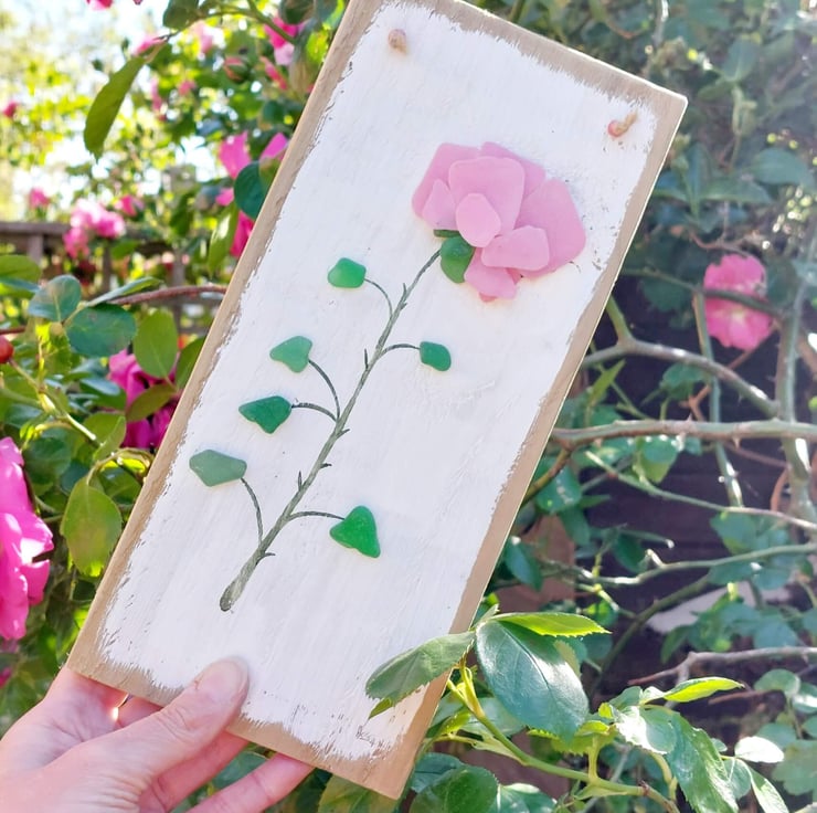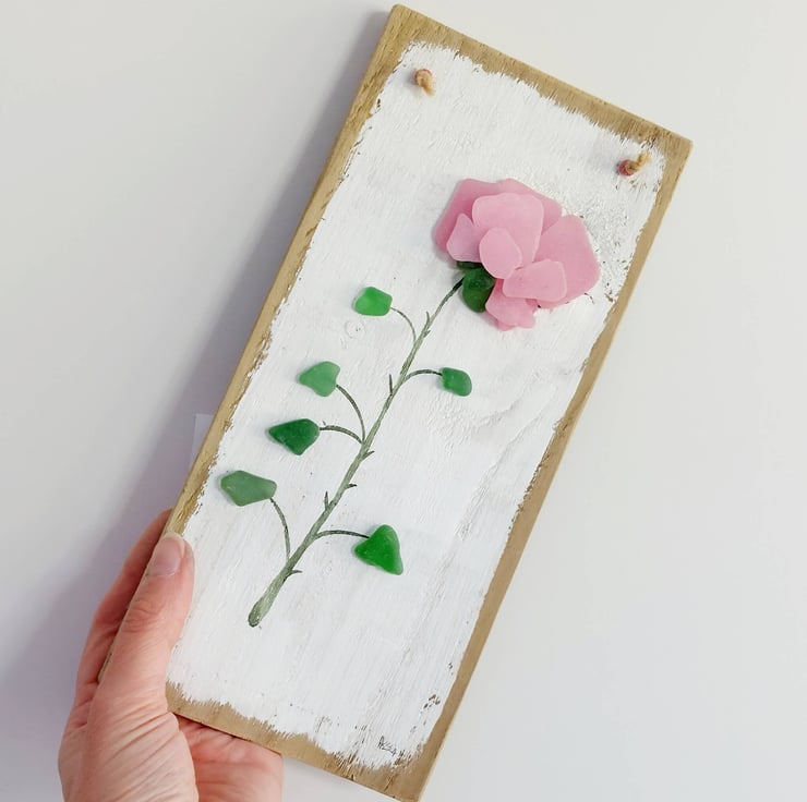 It features a striking pink rose stem crafted from hand painted sea glass and natural green sea glass with a watercolour painted stem. The entire artwork is mounted on a piece of reclaimed wood that has been carefully sanded, painted by hand, and varnished.