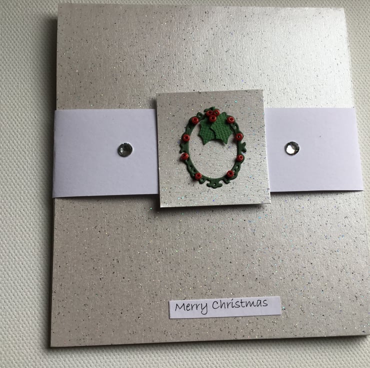 A handmade gift wallet with a handmade wreath and 2 shiny beads on a belly band.