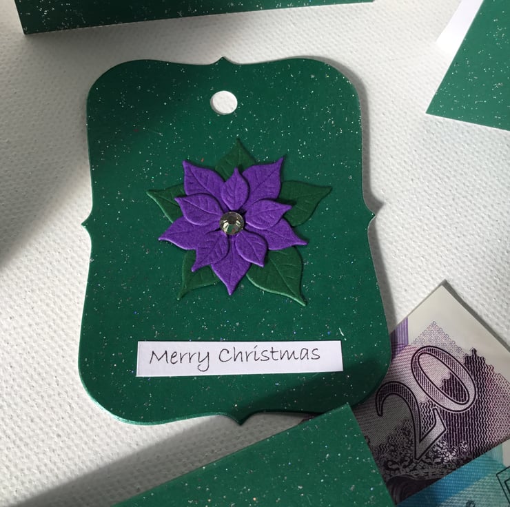 A set of 4 beautiful place card made from a deep green, slightly sparkly card with a handmade poinsettia flower in purple.