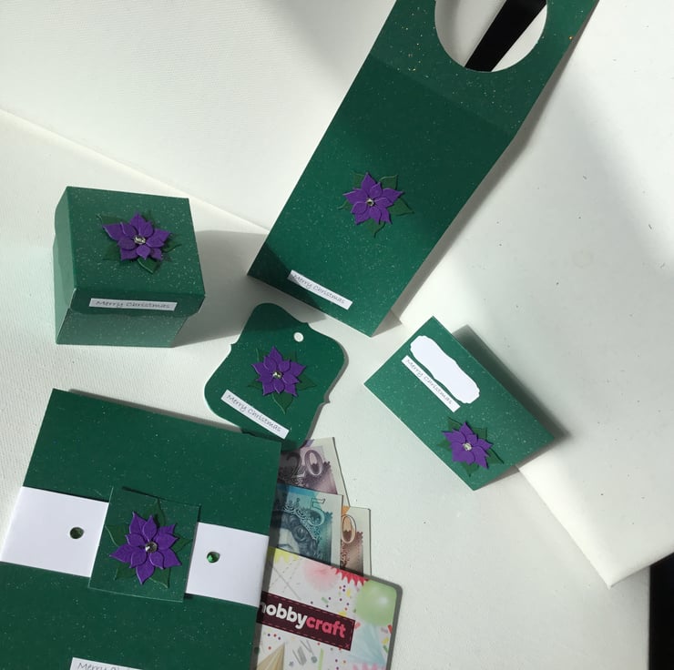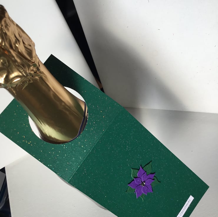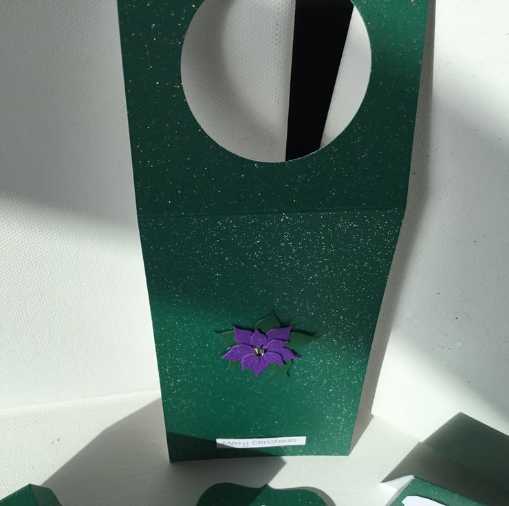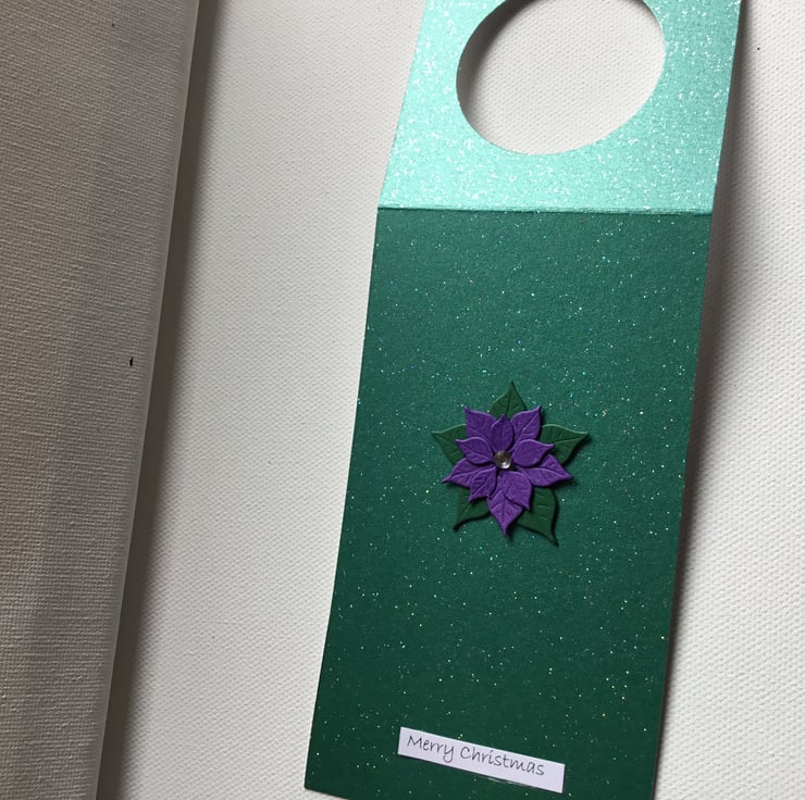 This is made from a deep green, slightly sparkly card and topped with a handmade purple poinsettia.
