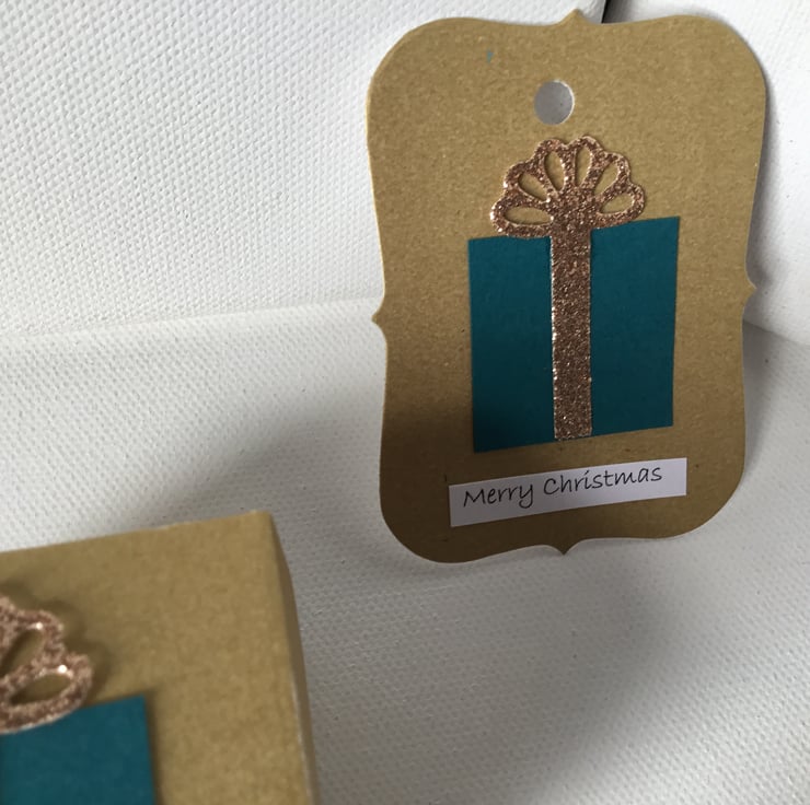It is made from sturdy gold card and topped with a white belly band with a teal gift and gold bow.