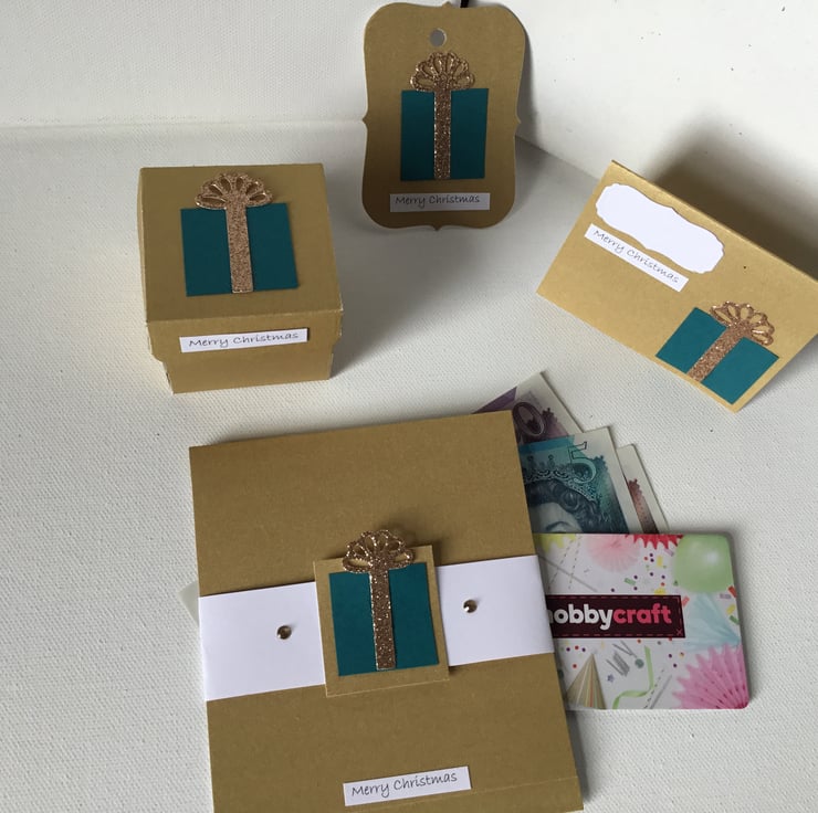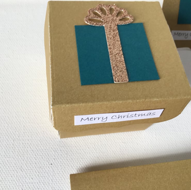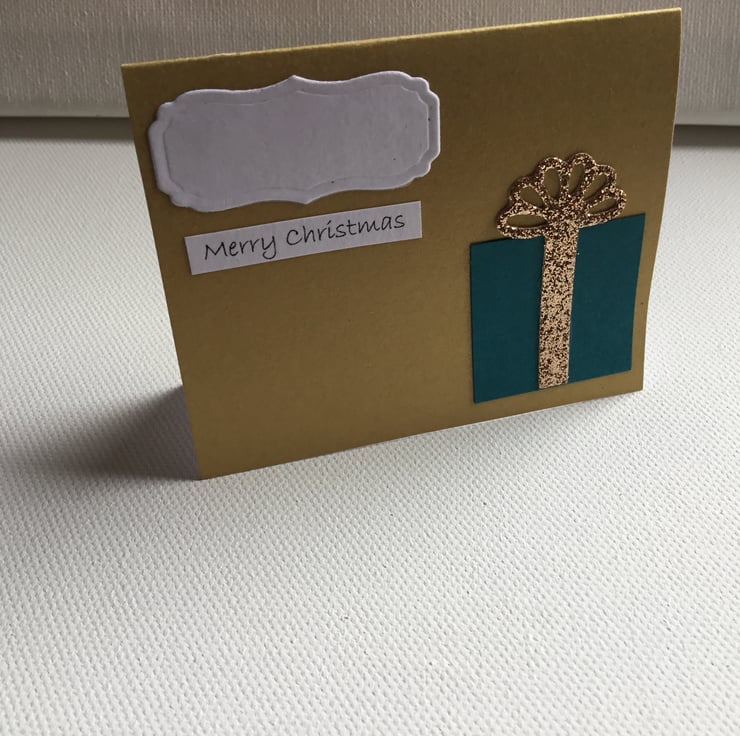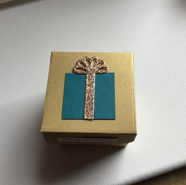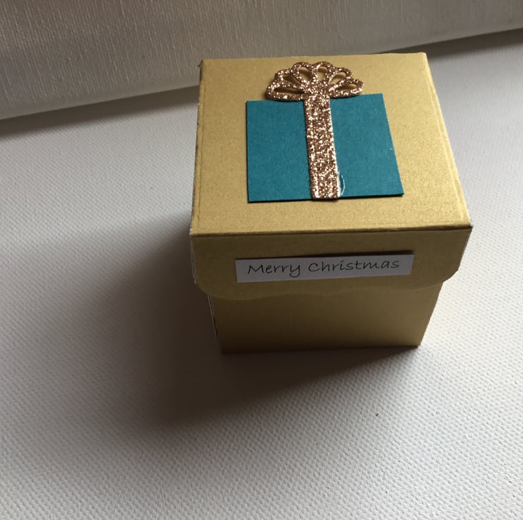 Made using sturdy gold card and topped with a teal gift with gold bow.