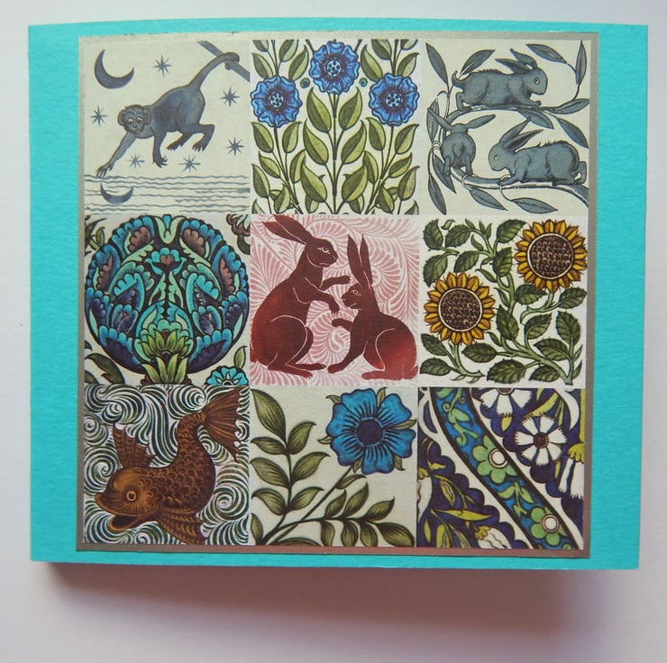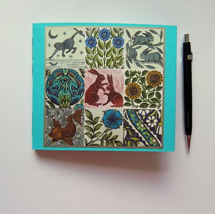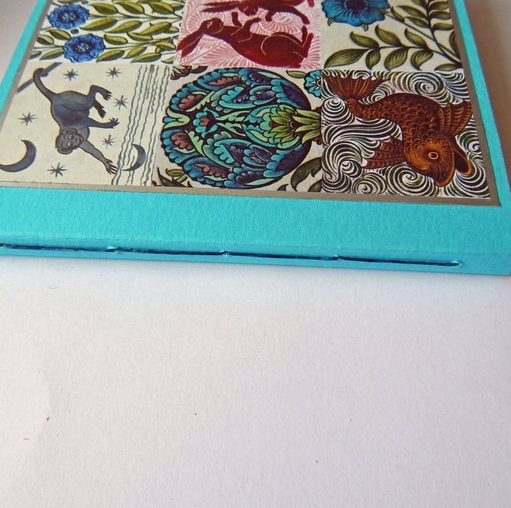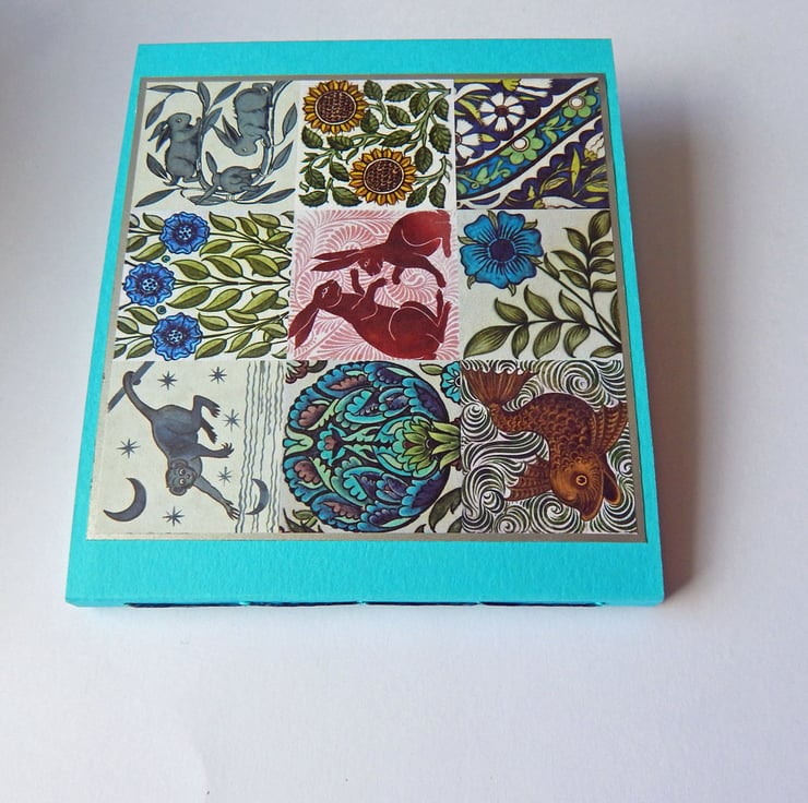 The front cover has a panel of decorative paper printed with some of Arts & Crafts designer William De Morgan's beautiful nature-inspired tile designs and mounted on silver paper.