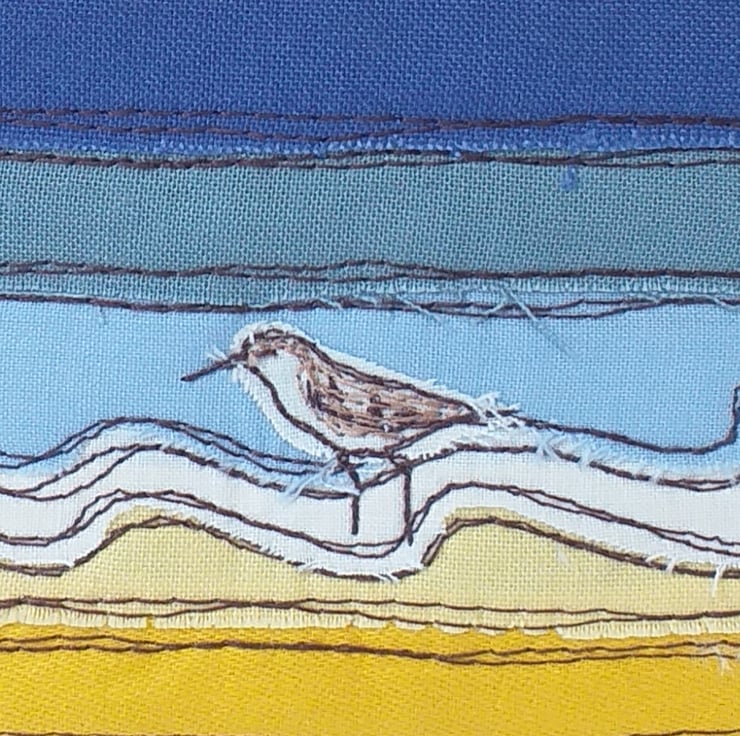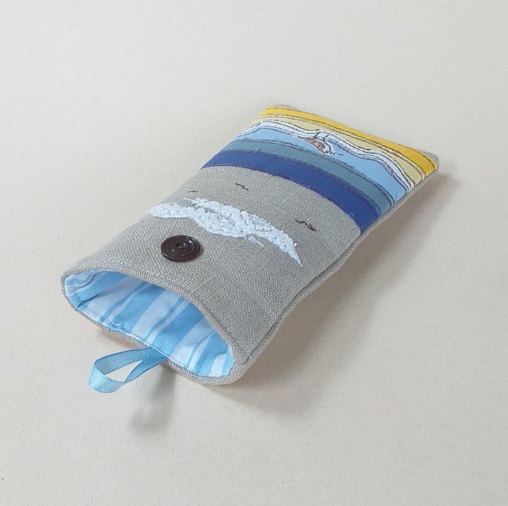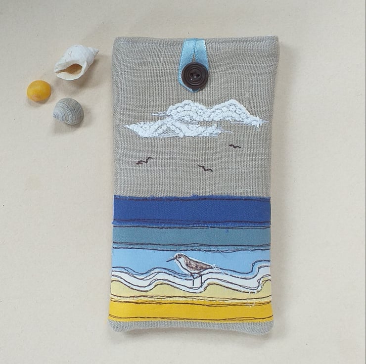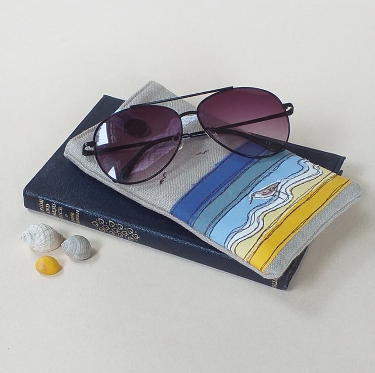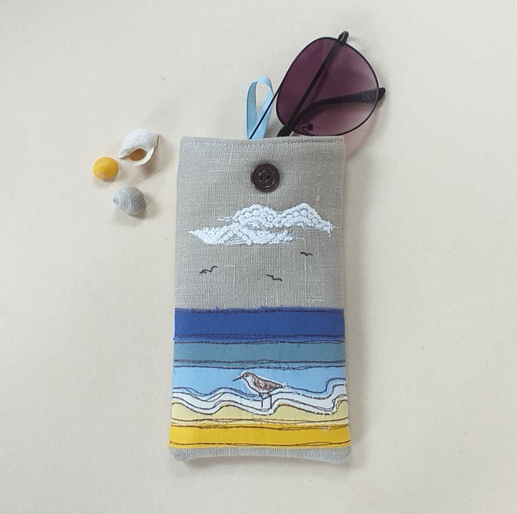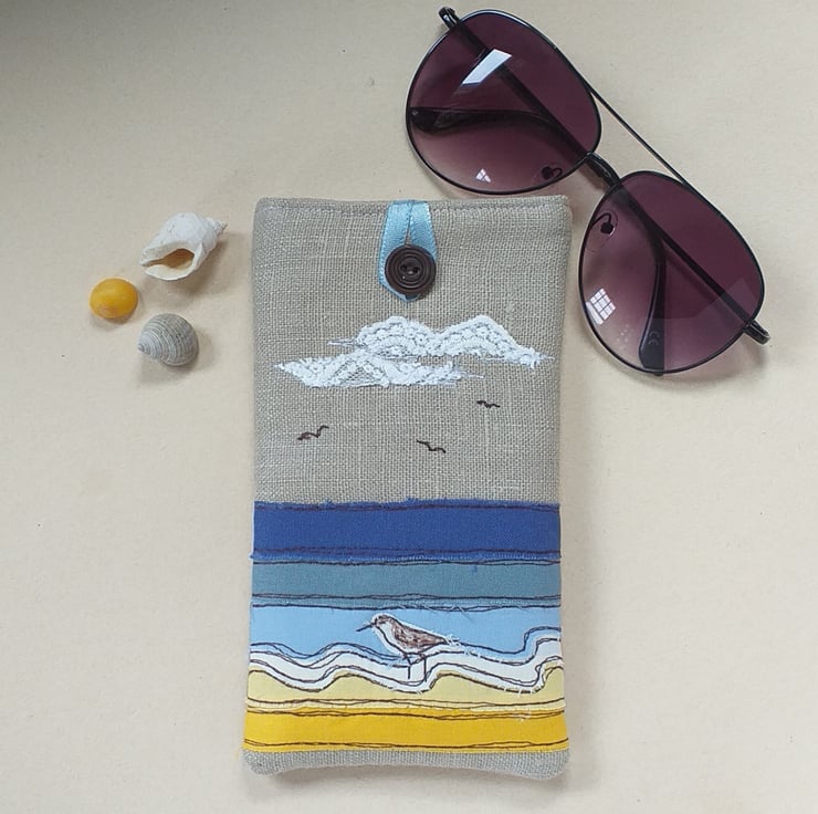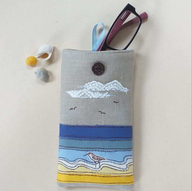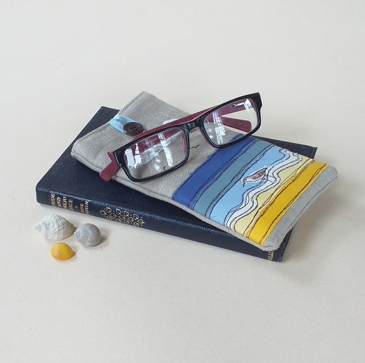 This is a soft but padded specs case perfect for sunglasses or reading glasses. It has a seaside design made by appliqueing strips of fabric in yellows and blues and sewing them with freestyle machine embroidery. There is a little embroidered sandpiper wading in the shallows and some fluffy lacy clouds. The case is made from linen with a lovely blue and white striped cotton lining continuing the seaside theme. It has a blue ribbon and button to hold it shut.
