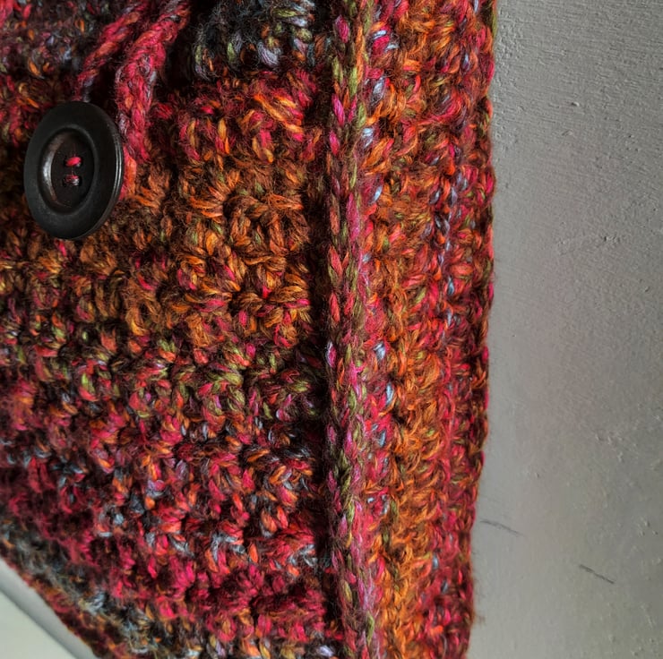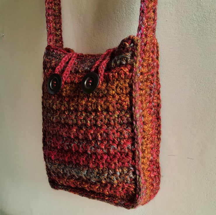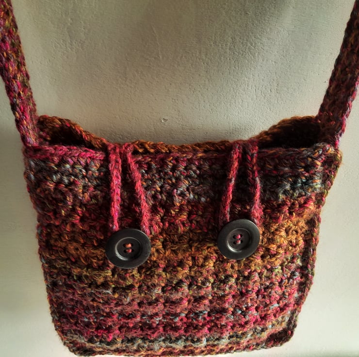 Crochet, multi-coloured shoulder bag, handmade with super soft, chunky yarn. Made with deep, rich, autumnal colours mixed together in blended, subtle stripes. This roomy bag two large, 4cm wooden buttons, with loop fastenings.