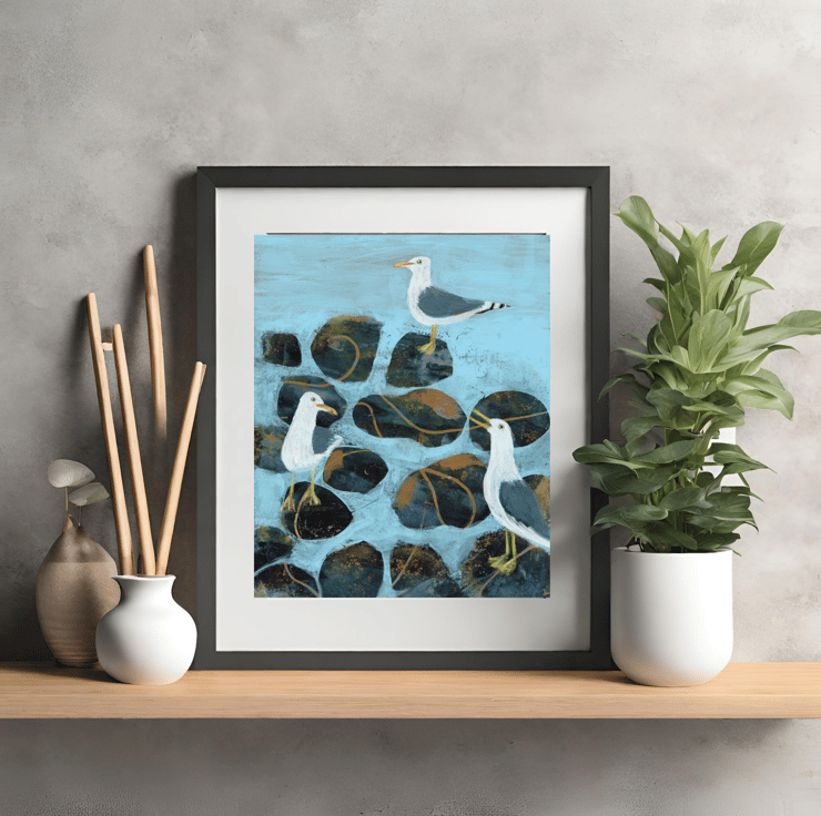 The background of the original painting this print comes from was a mono print and the gulls were painted on afterwards using acrylic paints.