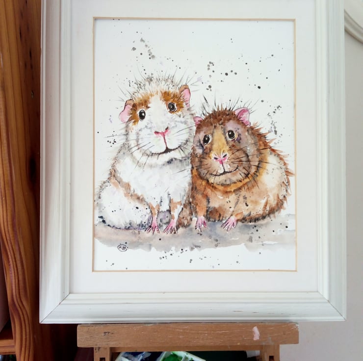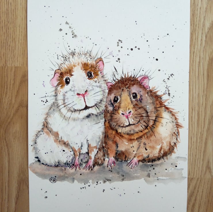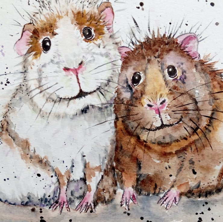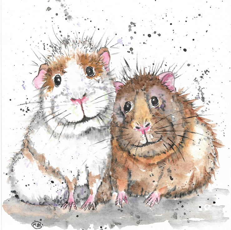 An original watercolour painting with ink accents of two cute guinea pigs. They are the best of friends.