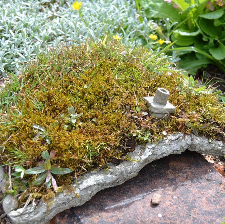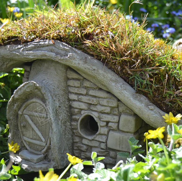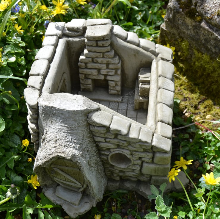 Hidden Corners is really excited about turf lodge and its concept which allows you to plant real turf on its roof. This allows the piece to be brought back to nature and fits in with any garden (Please note the turf is to be planted by yourself, the picture in the images is an example of what we have done). The roof on turf lodge lifts off to expose the detail that has been carried on inside. Turf lodge has open windows allowing you to peek inside its interior at the tiny fairy sized books on the bookshelf and the built-up fireplace that is in line with the chimney on the roof. Turf lodge is supplied with 2x sets of stepping stones allowing them to be place where you desire either using them to lead your fairies to the door or use them to link up your fairy village by collecting the other amazing products in our fairy house range.
