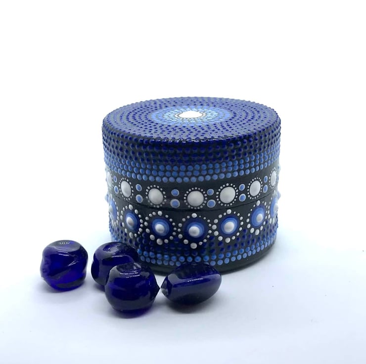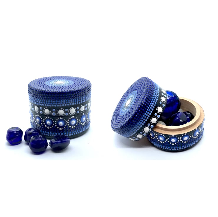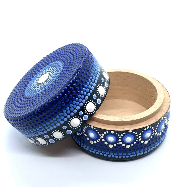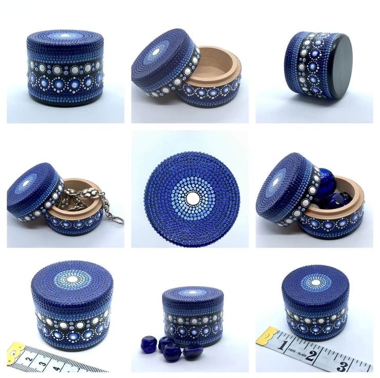 I painted this little ring box in blue & white, in the style of a mandala pattern with layered dots. The inside has been left plain for a natural look. It measures 2" across and 2" in height. The box has been protected with 2 coats of extreme heavy duty varnish in a satin finish.
