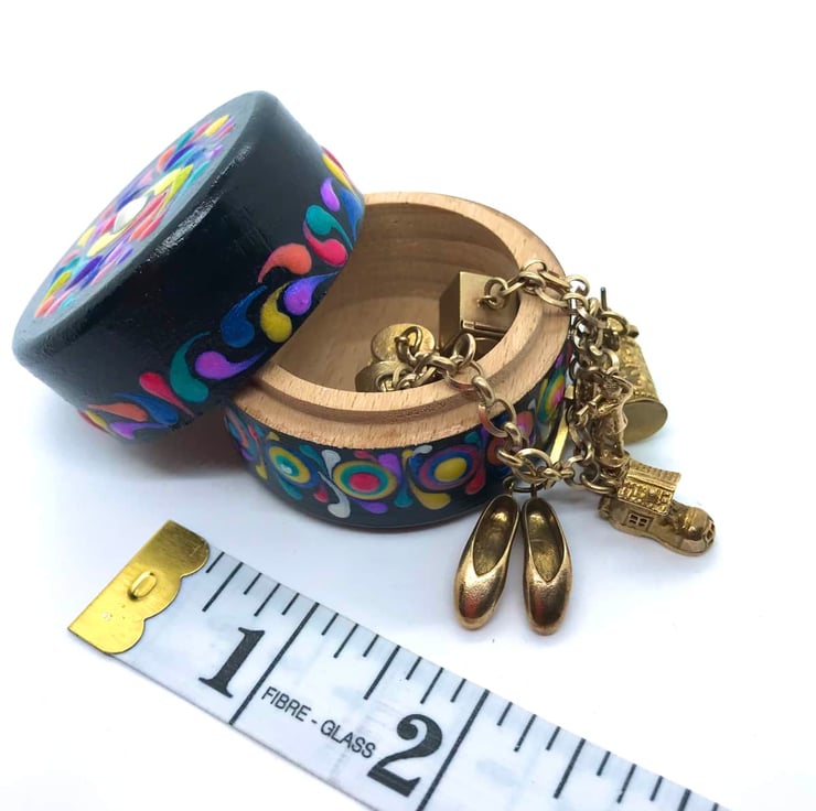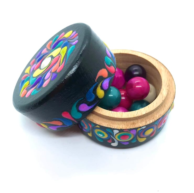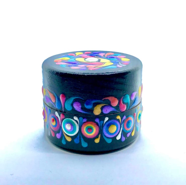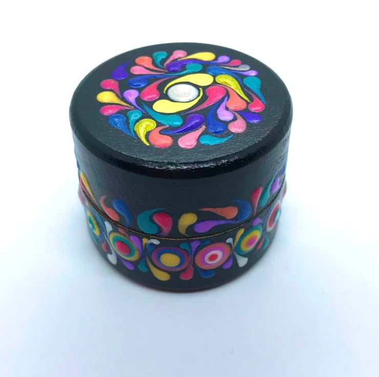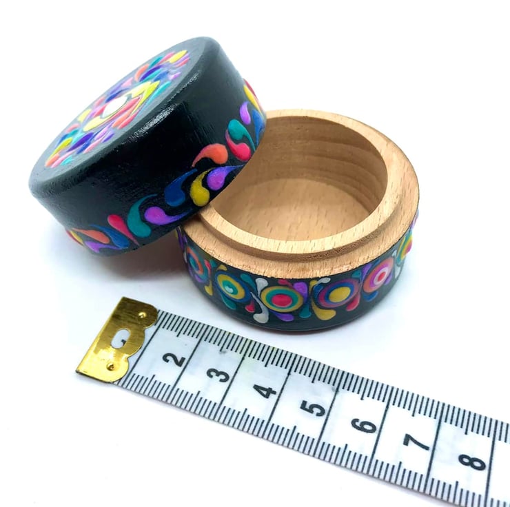 I painted this little ring box in rainbow colours, in the style of a mandala pattern with layered dots and swooshes. The inside is plain natural wood. It measures 2"across and is 2" in height. The box has been protected with 2 coats of extreme heavy duty varnish in a satin finish.
