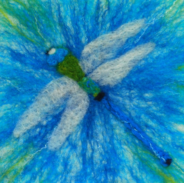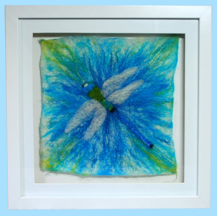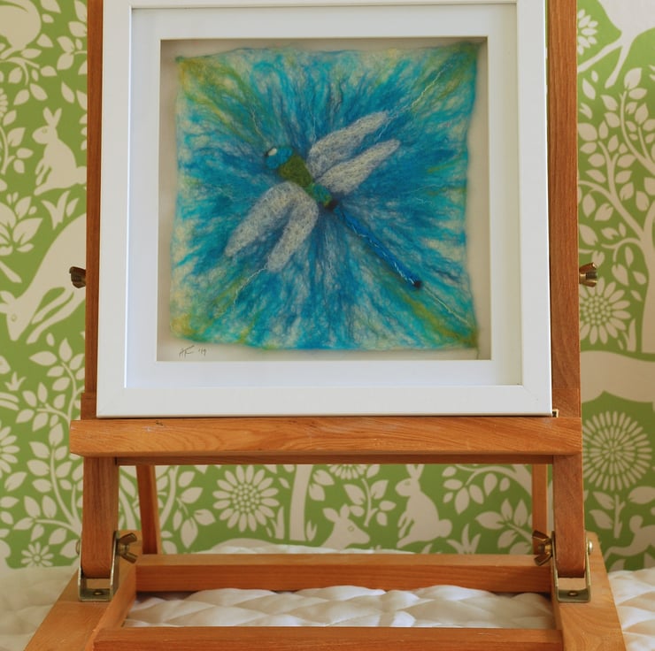 The background is wet felted. It is a process that involves laying down multiple layers of raw un-spun merino wool, which is then moistened and repeatedly rolled until all the wool fibres mesh or 'felt' together. I don’t completely felt the wool so that individual fibres are still visible and add texture to the image. Once dry I added the elements of the dragonfly (wet felted pieces of different colours) via needle felting.
