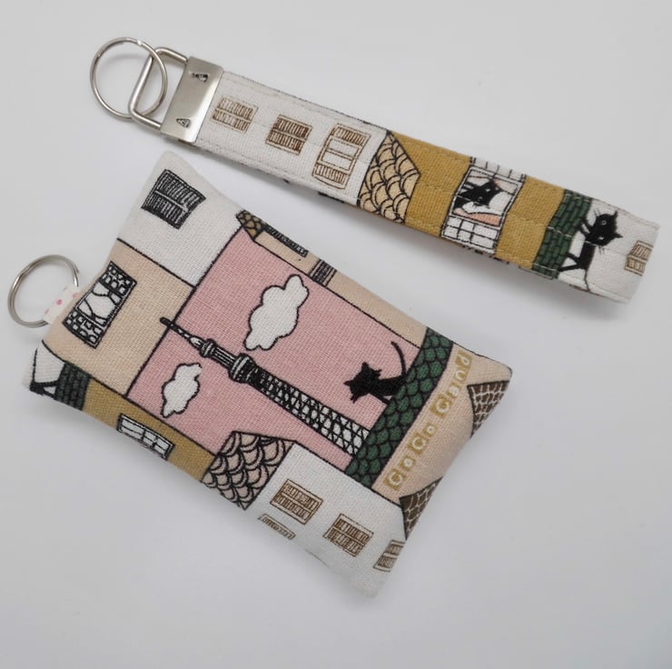 The strap of the matching keyring measures 14cm (so 28cm all the way round) and 2.5cm wide. It has been interlined with a strip of felt, is topstitched and has a silver tone key ring.