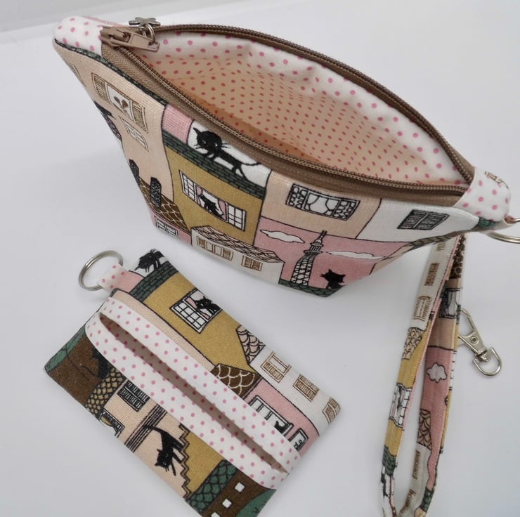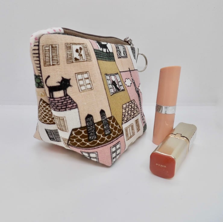 Small make up bag is lined and trimmed with pink and white spot quilting cotton. There's a key ring tab in one side seam to add keys, a charm, or to clip safety inside your bag. The beige zip across the top is finished with a little flower charm. Bag measures about 17cm x 10cm and I have boxed the base so that it stands up on it's own.