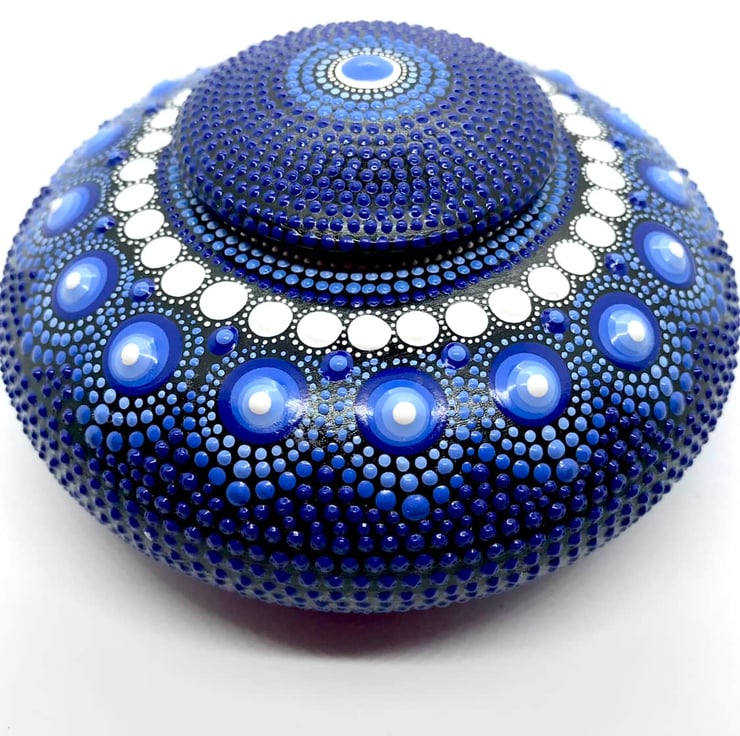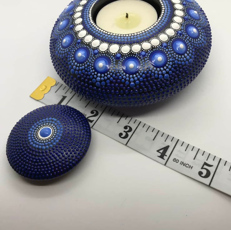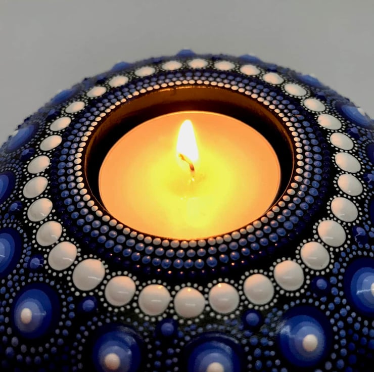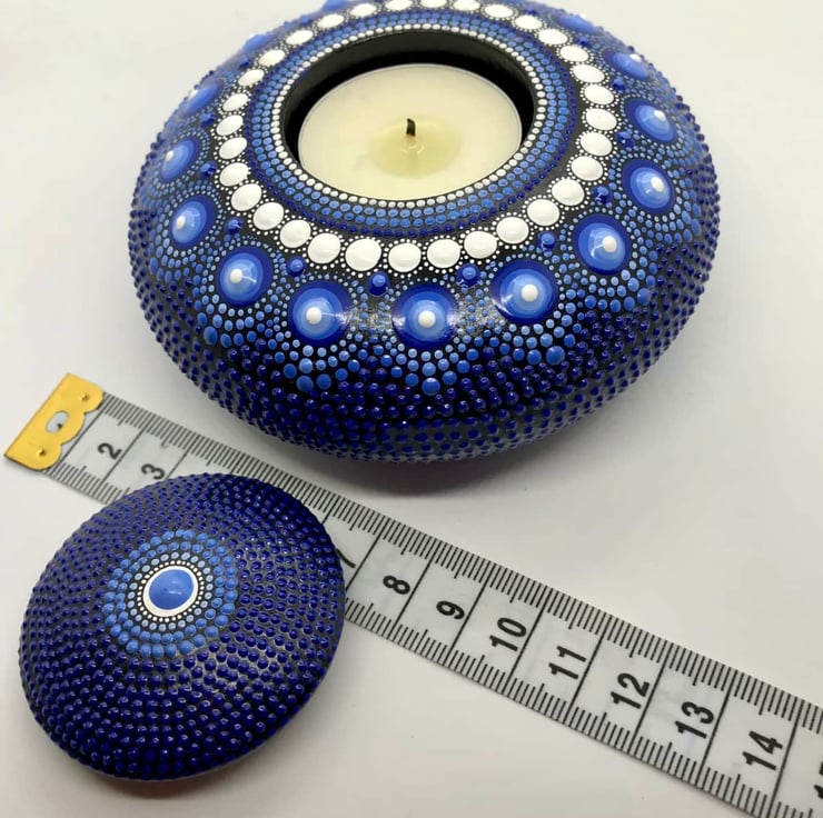 A tea light holder with a matching lid. Made from robust CrystalCal plaster, and hand painted blue and white in a dotted mandala style.