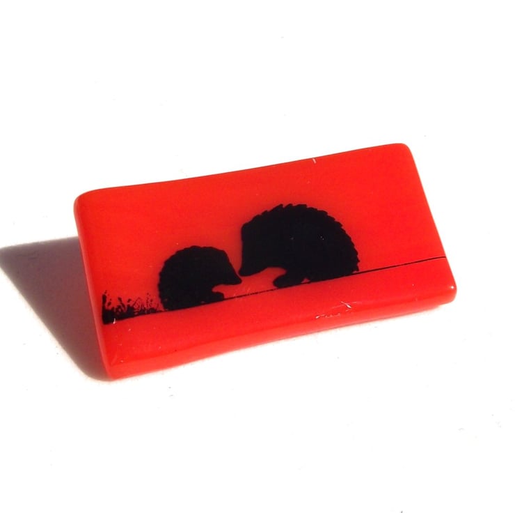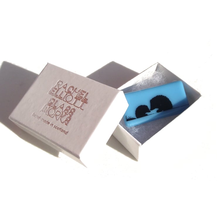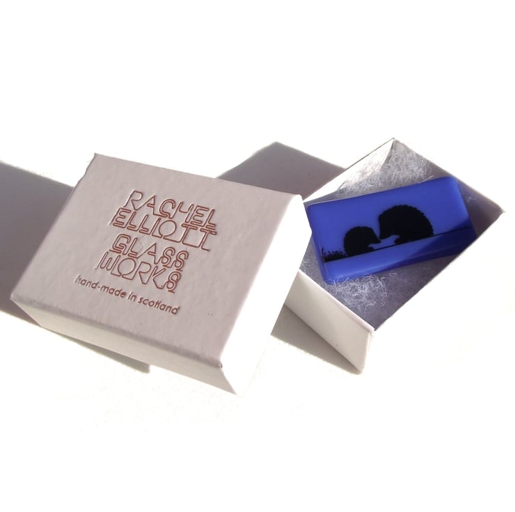 These brooches are handmade from opaque coloured flat glass with a hedgehogs silhouette design, hand screen printed in kiln fired enamel onto the surface. After firing, it is carefully digitally cooled for strength and safety, before being mounted on a nickel-free silver plated brooch finding and come in a gift box with a story card.