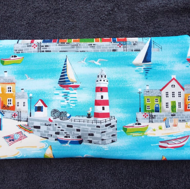 It measures 12" x 7" and has wadding 'sandwiched' between the seaside fabric and the turquoise bottom.